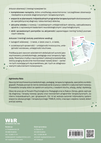 Publikacja jest owocem wieloletnich doświadczeń autorki jako wychowawcy przedszkolnego, pedagoga oraz terapeuty logopedy. Powstała z myślą o nauczycielach edukacji przedszkolnej, którzy pragną skutecznie monitorować rozwój dzieci – zarówno tych rozwijających się prawidłowo, jak i tych ze zdiagnozowanymi zaburzeniami rozwojowymi.
