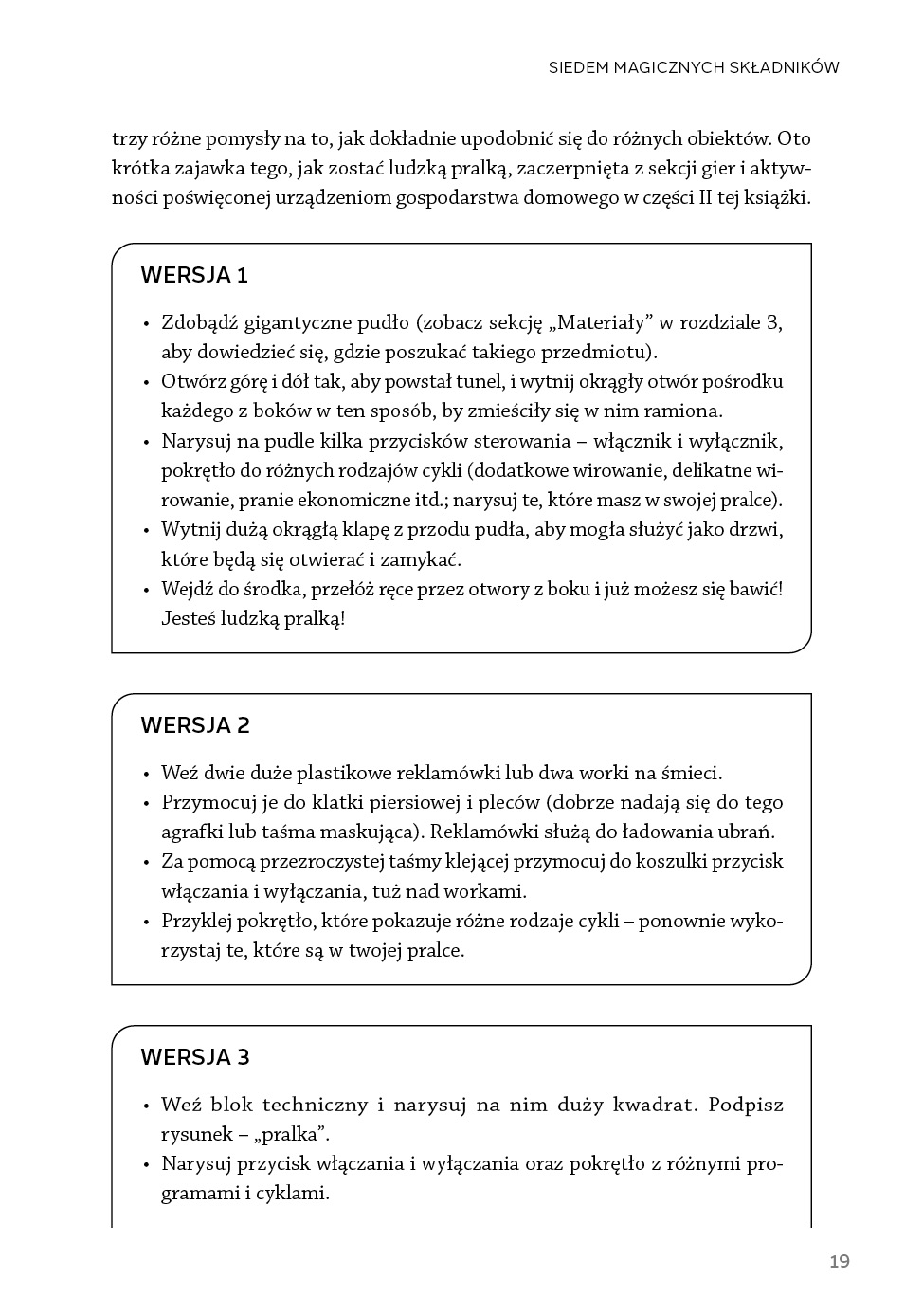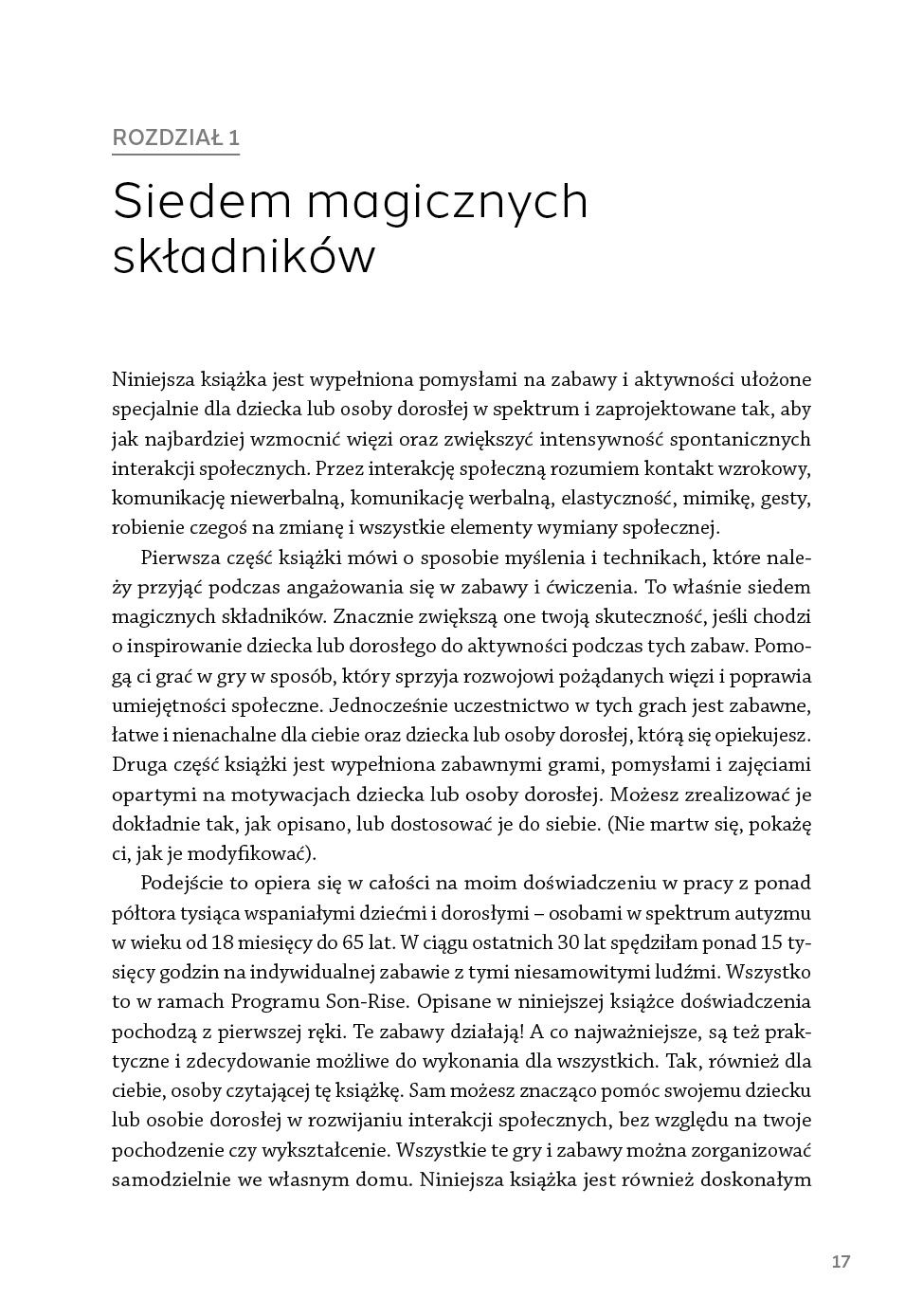 Jest na to sposób! Książka Autyzm? Abrakadabra! zawiera ponad 180 pomysłów na aktywności nawiązujące do najczęstszych szczególnych zainteresowań osób z autyzmem. W zabawach może uczestniczyć cała rodzina, co pozytywnie wpływa na relacje między wszystkimi jej członkami i pozwala wszechstronnie rozwijać umiejętności społeczne dziecka. Kate Wilde pokazuje, jak wykorzystać siedem magicznych składników zabawy i kreatywnie wprowadzić tematykę fascynującą dziecko, niezależnie od tego, czy do jego pasji należą pociągi, samoloty lub sprzęt AGD, czy też najbardziej ciekawią je zwierzęta, ludzkie ciało, owady albo bohaterowie filmów i seriali. Autorka opisuje, jak zastosować pięć przekonań potrzebnych, by nadać ćwiczeniom odpowiednią moc, pojąć, jak ważne jest rozpoczęcie i zakończenie zabawy w odpowiednim momencie, a także właściwie odczytać sygnały płynące z zachowania dziecka.