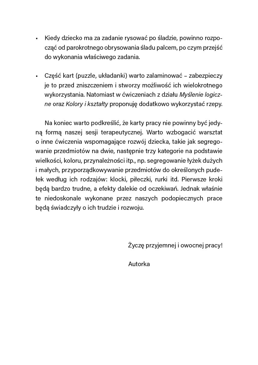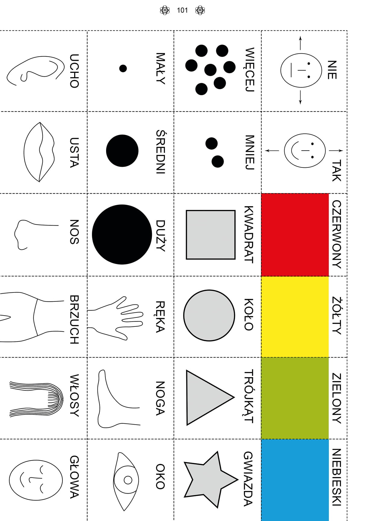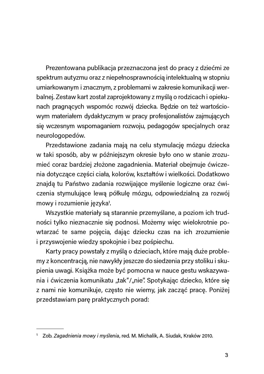 Publikacja przeznaczona jest do pracy z dziećmi ze spektrum autyzmu oraz z niepełnosprawnością intelektualną w stopniu umiarkowanym i znacznym, z problemami w zakresie komunikacji werbalnej. Zestaw kart został zaprojektowany z myślą o rodzicach i opiekunach pragnących wspomóc rozwój dziecka, jednak będzie też wartościowym materiałem dydaktycznym w pracy profesjonalistów wczesnego wspomagania rozwoju, pedagogów specjalnych oraz neurologopedów. Przedstawione zadania mają na celu stymulację mózgu dziecka w taki sposób, aby w późniejszym okresie było ono w stanie zrozumieć coraz bardziej złożone zagadnienia. Materiał obejmuje ćwiczenia dotyczące części ciała, kolorów, kształtów i wielkości. Dodatkowo znajdą tu Państwo zadania rozwijające myślenie logiczne oraz ćwiczenia stymulujące lewą półkulę mózgu, odpowiedzialną za rozwój mowy i rozumienie języka.