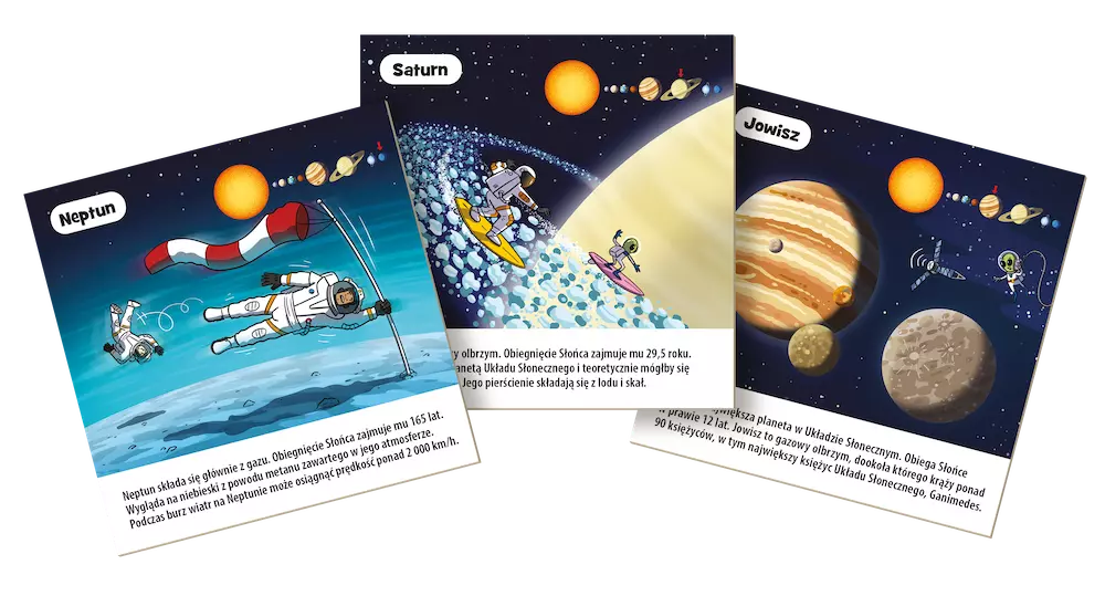 Wybierz się w lot poprzez naszą galaktykę (a nawet poza jej granice!) z BrainBox – Kosmos! W poręcznym opakowaniu znajdziesz 25 kart, a na nich informacje o Słońcu i planetach Układu Słonecznego. Angażujący sposób rozgrywki sprawi, że Twoje dziecko bez wysiłku będzie poszerzało swoją wiedzę a może nawet spotka prawdziwych kosmitów!