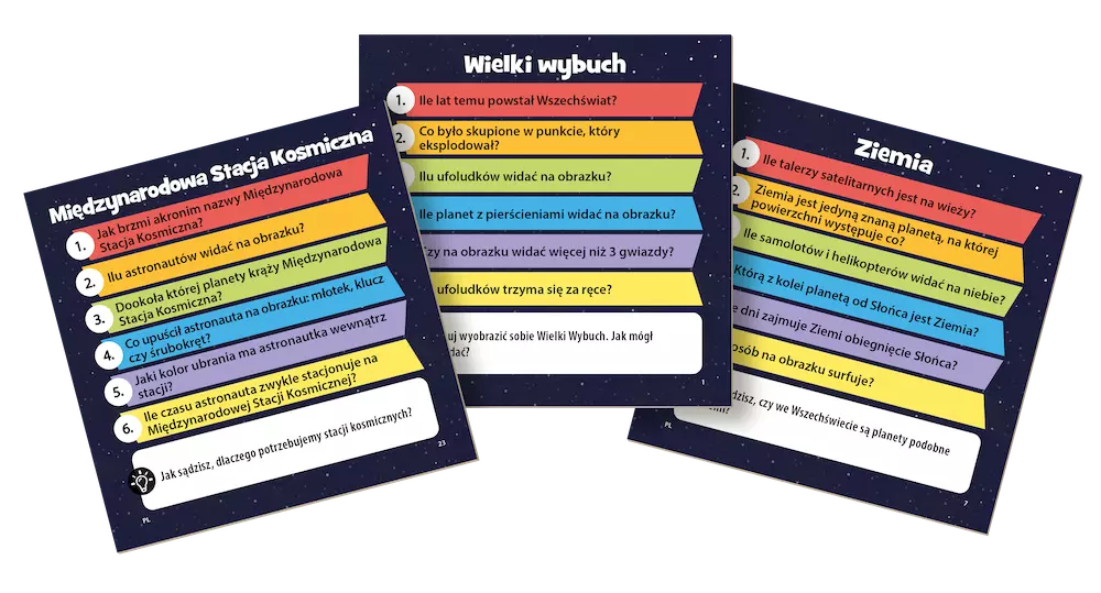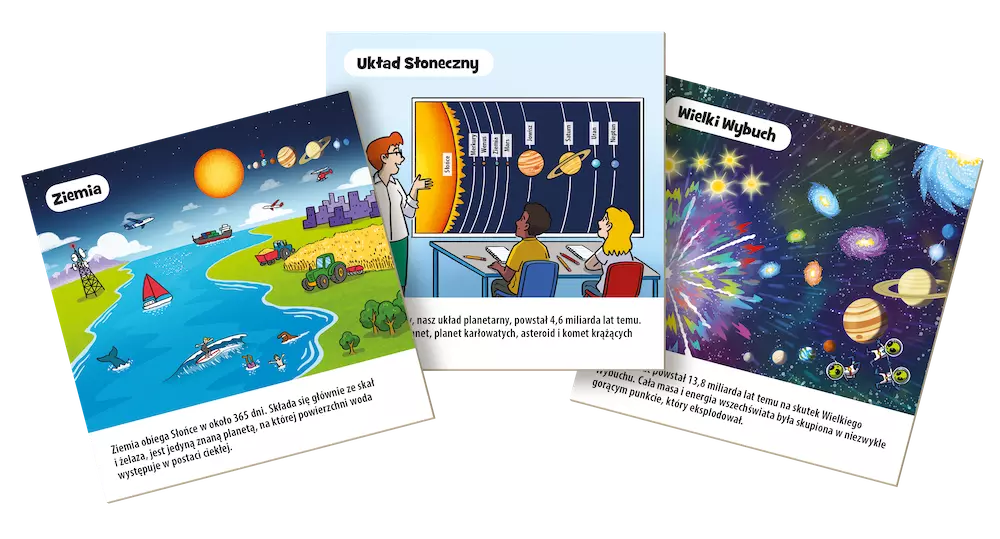 Każde pudełko to zestaw kart, które po jednej stronie mają obrazek (należy przyjrzeć mu się przez określony czas), a z drugiej zestaw pytań, sprawdzających nie tylko naszą pamięć, ale też wiedzę z zakresu danego przedmiotu.