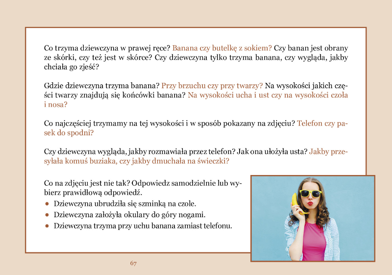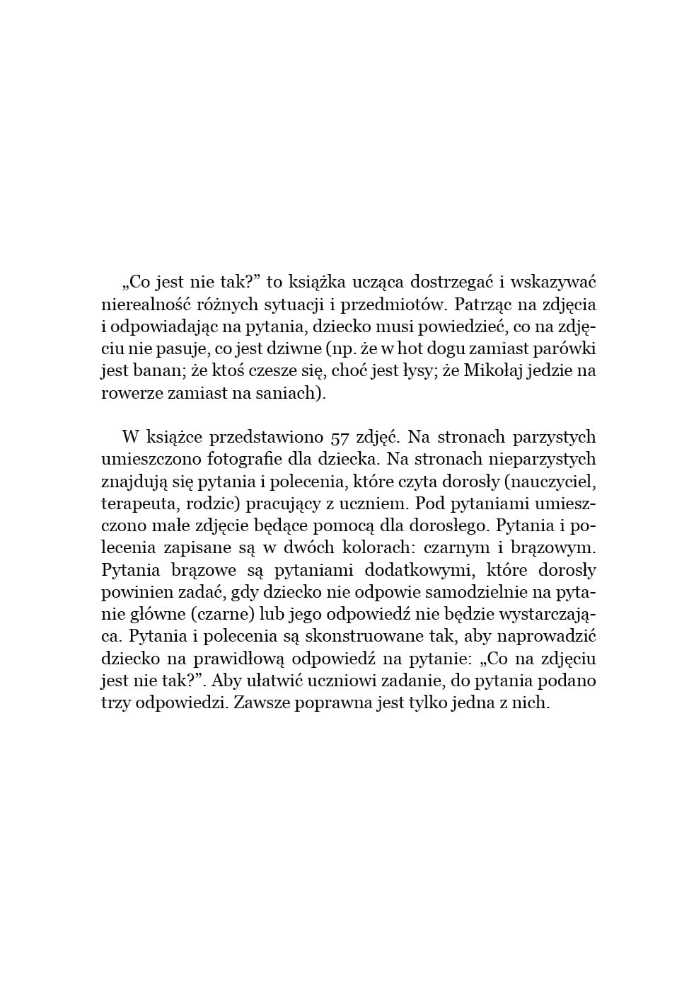 „Co jest nie tak?” to książka ucząca dostrzegać i wskazywać nierealność różnych sytuacji i przedmiotów. Patrząc na zdjęcia i odpowiadając na pytania, dziecko musi powiedzieć, co na zdjęciu nie pasuje, co jest dziwne. W książce przedstawiono 57 zdjęć. Na stronach parzystych umieszczono fotografie dla dziecka. Na stronach nieparzystych znajdują się pytania i polecenia, które czyta dorosły (nauczyciel, terapeuta, rodzic) pracujący z uczniem.