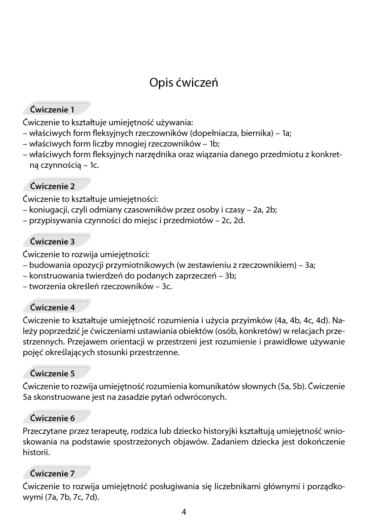 Celem ćwiczeń, przygotowanych dla nauczycieli, terapeutów i rodziców pracujących z dzieckiem, jest rozwijanie jego systemu językowego w obszarze przede wszystkim morfologii (głównie fleksji) i składni. Zadaniem dziecka pracującego z książką jest podanie właściwej formy wyrazu, połączenie w pary odpowiednich słów, podanie sekwencji zdarzeń. Terapeuta wyjaśnia zasadę ćwiczenia i podaje wzór według którego należy je wykonać.