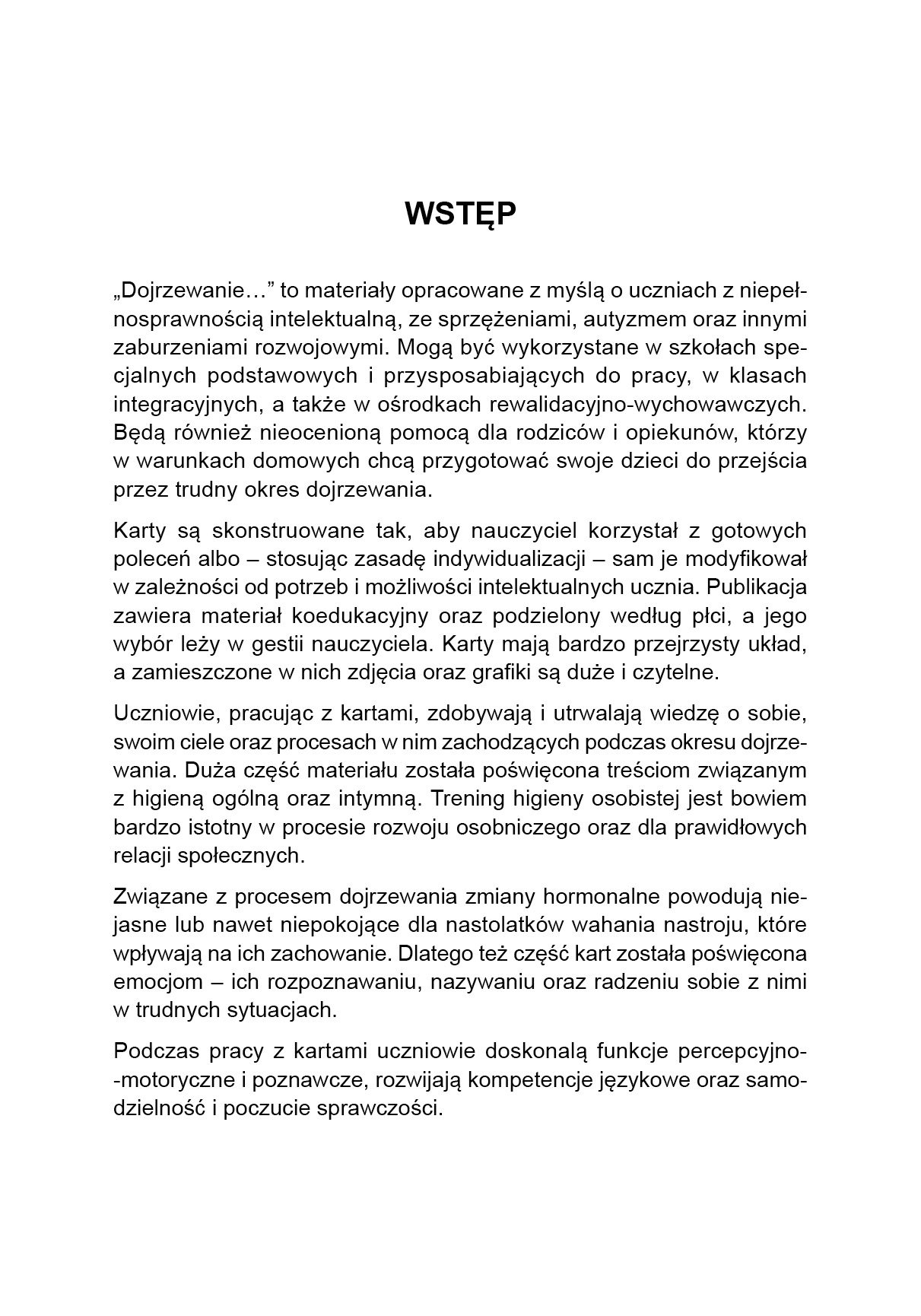 „Dojrzewanie…” to materiały opracowane z myślą o uczniach z niepełnosprawnością intelektualną, ze sprzężeniami, autyzmem oraz innymi zaburzeniami rozwojowymi. Mogą być wykorzystane w szkołach specjalnych podstawowych i przysposabiających do pracy, w klasach integracyjnych, a także w ośrodkach rewalidacyjno-wychowawczych. Będą również nieocenioną pomocą dla rodziców i opiekunów, którzy w warunkach domowych chcą przygotować swoje dzieci do przejścia przez trudny okres dojrzewania. Publikacja zawiera materiał koedukacyjny oraz podzielony według płci. Karty mają bardzo przejrzysty układ, a zamieszczone zdjęcia oraz grafiki są duże i czytelne.