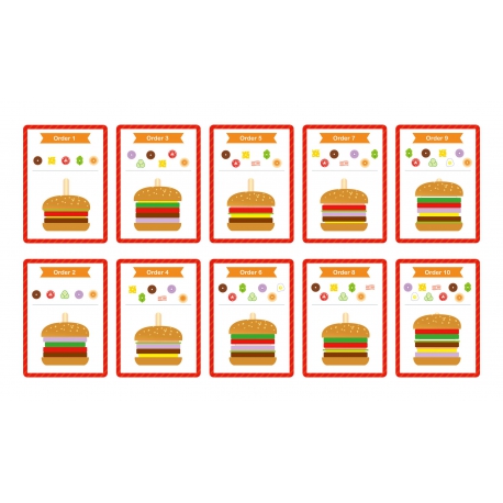Dziecko wybiera potrzebne składniki, a następnie patrząc na grubość i kolor układa składniki zgodnie z kolejnością. Zabawę można urozmaicić o grę w zapamiętywanie i odtwarzanie z pamięci obrazka przez malucha. Można również zakryć na karcie składniki, a dziecko na podstawie samego wyglądu może dobrać potrzebne składniki i ułożyć hamburgera. Dziecko może również wymyślić swój własny wygląd burgera – ogranicza tylko kreatywność i wyobraźnia