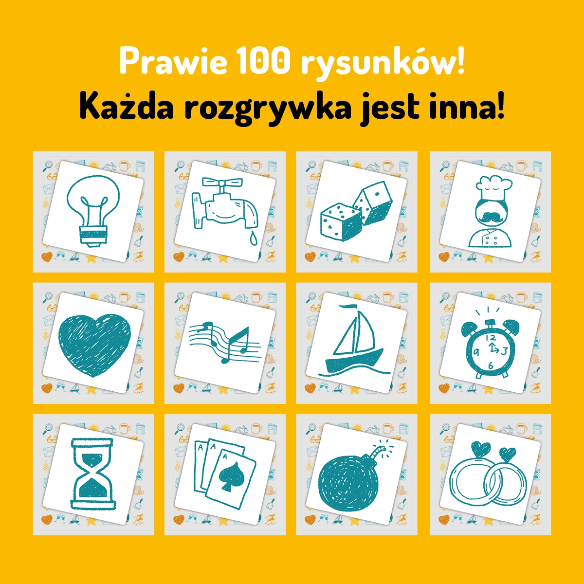 Co łączy kucharza i serce? Albo budzik i obrączki? Uruchom wyobraźnię i wymyśl szalone skojarzenia. Ale takie, na które wpadną również współgracze! Podczas rozgrywki będziecie tworzyć i zapamiętywać skojarzenia, a na koniec gry wspólnie będziecie walczyć o punkty za zapamiętane karty.