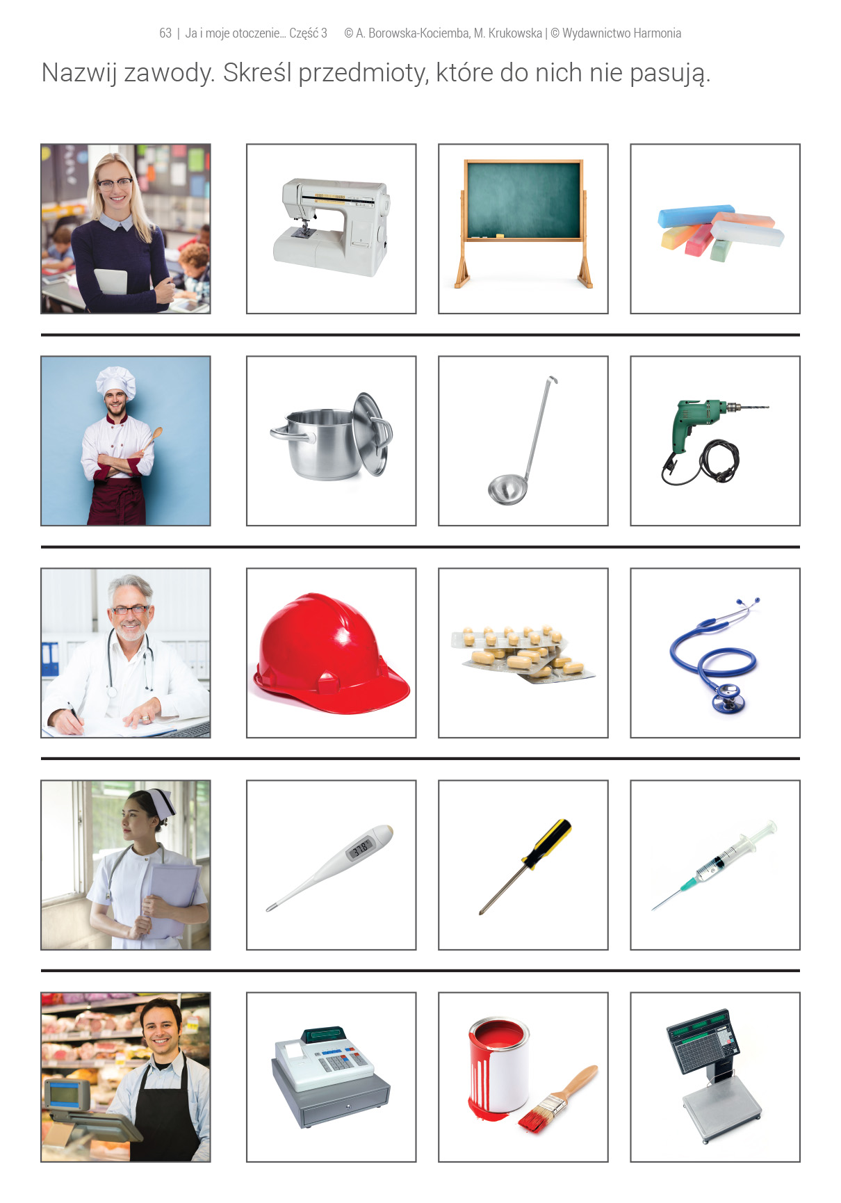 Karty pracy powstały z myślą o nauczycielach i terapeutach pracujących z uczniami z niepełnosprawnością intelektualną w stopniu umiarkowanym i znacznym, ze sprzężeniami oraz z dziećmi mającymi trudności w uczeniu się. Materiał można wykorzystywać jako pomoc edukacyjną w szkołach specjalnych, klasach integracyjnych, na zajęciach rewalidacyjnych. Karty będą przydatne również rodzicom do pracy z dziećmi w domu. Treść kart pracy odpowiada rozkładowi materiału nauczania dla uczniów z niepełnosprawnością intelektualną i jest zgodna z podstawą programową.
