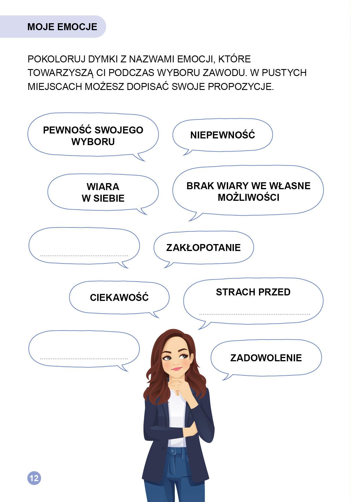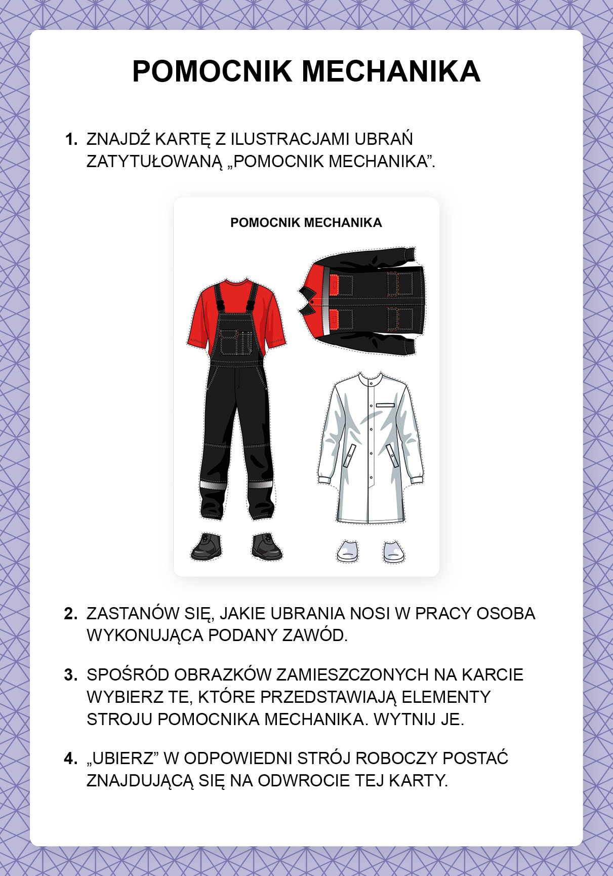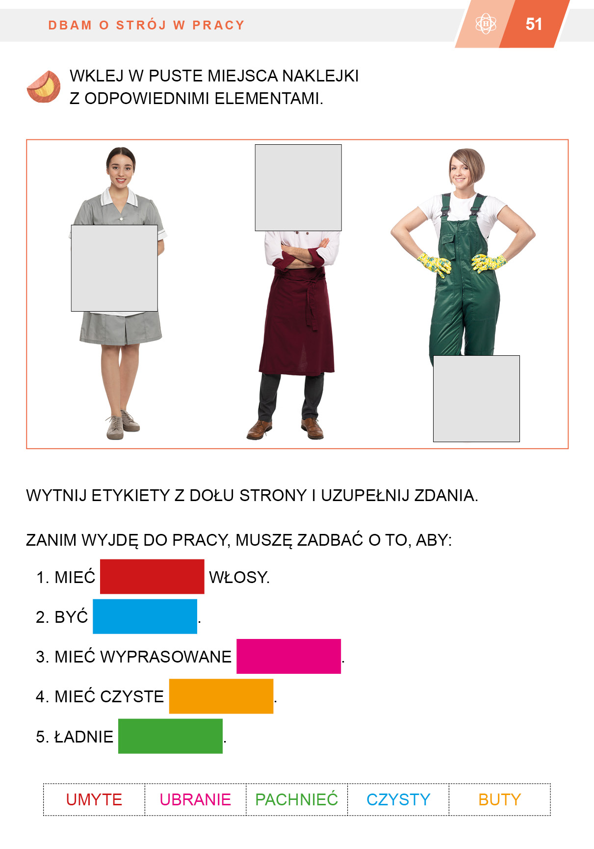 W teczce wraz z kartami pracy znajdują się również dzienniczek coachingowy oraz plansze do nauki doboru stroju roboczego.