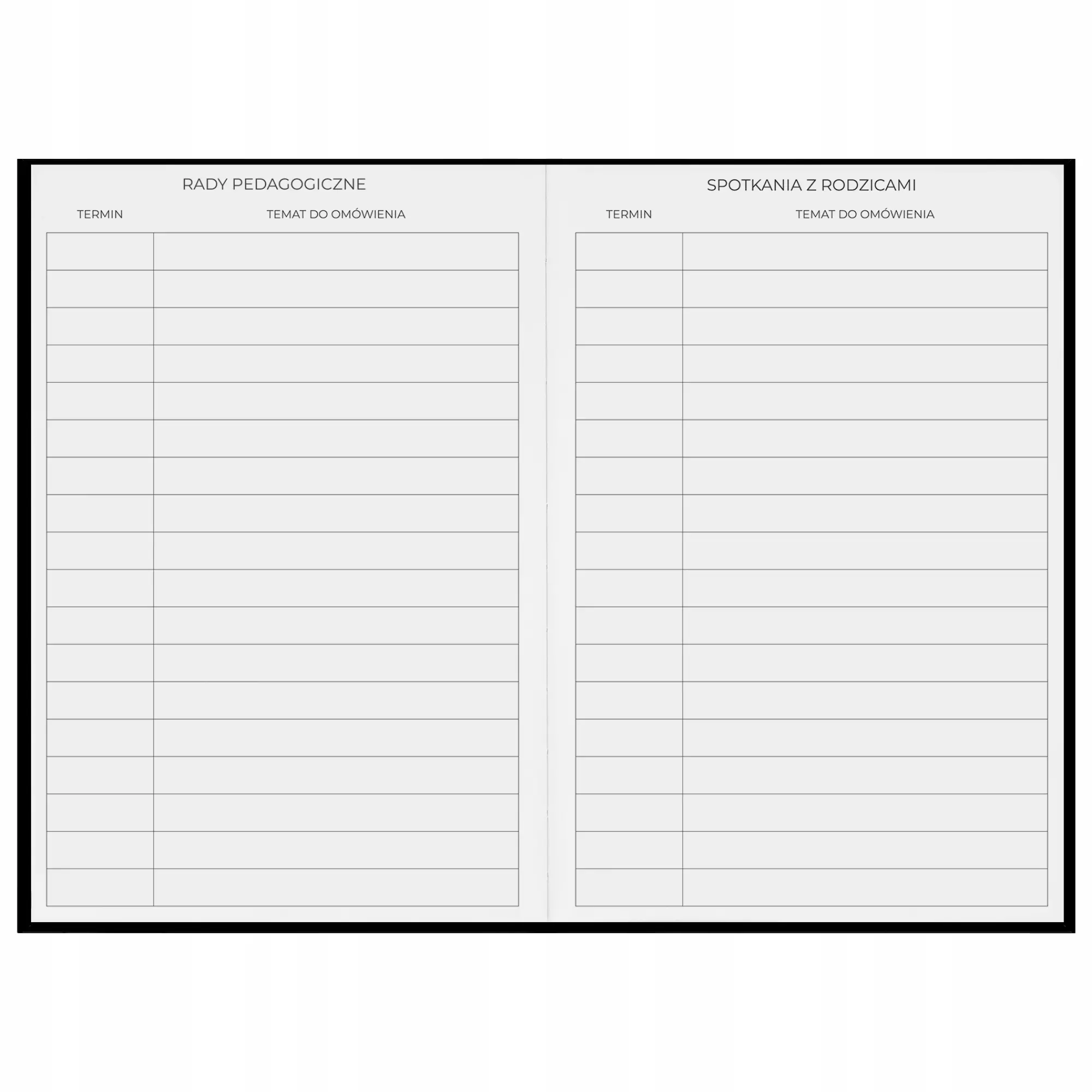 Kalendarz zawiera również segmenty na rady pedagogiczne, terminarz spotkań z rodzicami oraz przestrzeń na podręczne notatki. Przemyślana struktura wspiera nie tylko planowanie zadań, ale także rozwijanie dobrych nawyków organizacyjnych oraz efektywne zarządzanie czasem w pracy dydaktycznej. Dzięki odpowiednio wydzielonym miejscom na cele, notatki i zadania, nauczyciel może skupić się na tym, co najważniejsze.