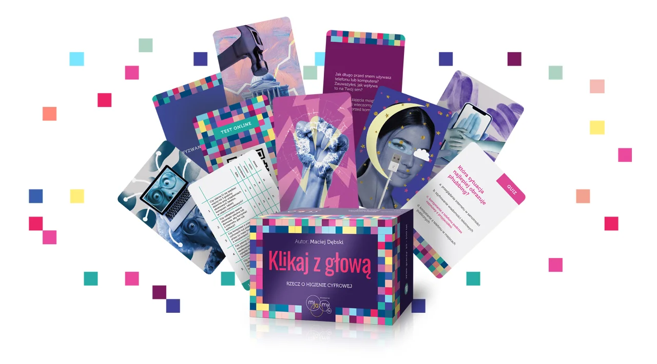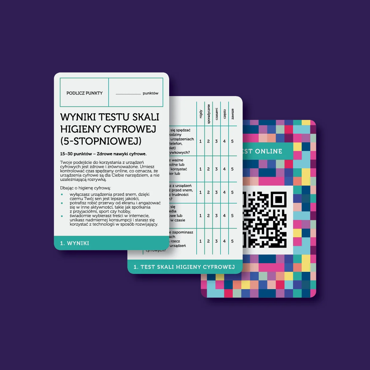 - Karty tematyczne- 60 pytań, które otwierają przestrzeń do refleksji i rozmowy na temat najważniejszych aspektów życia w świecie cyfrowym i jego wpływu na nasze zdrowie fizyczne i psychiczne.