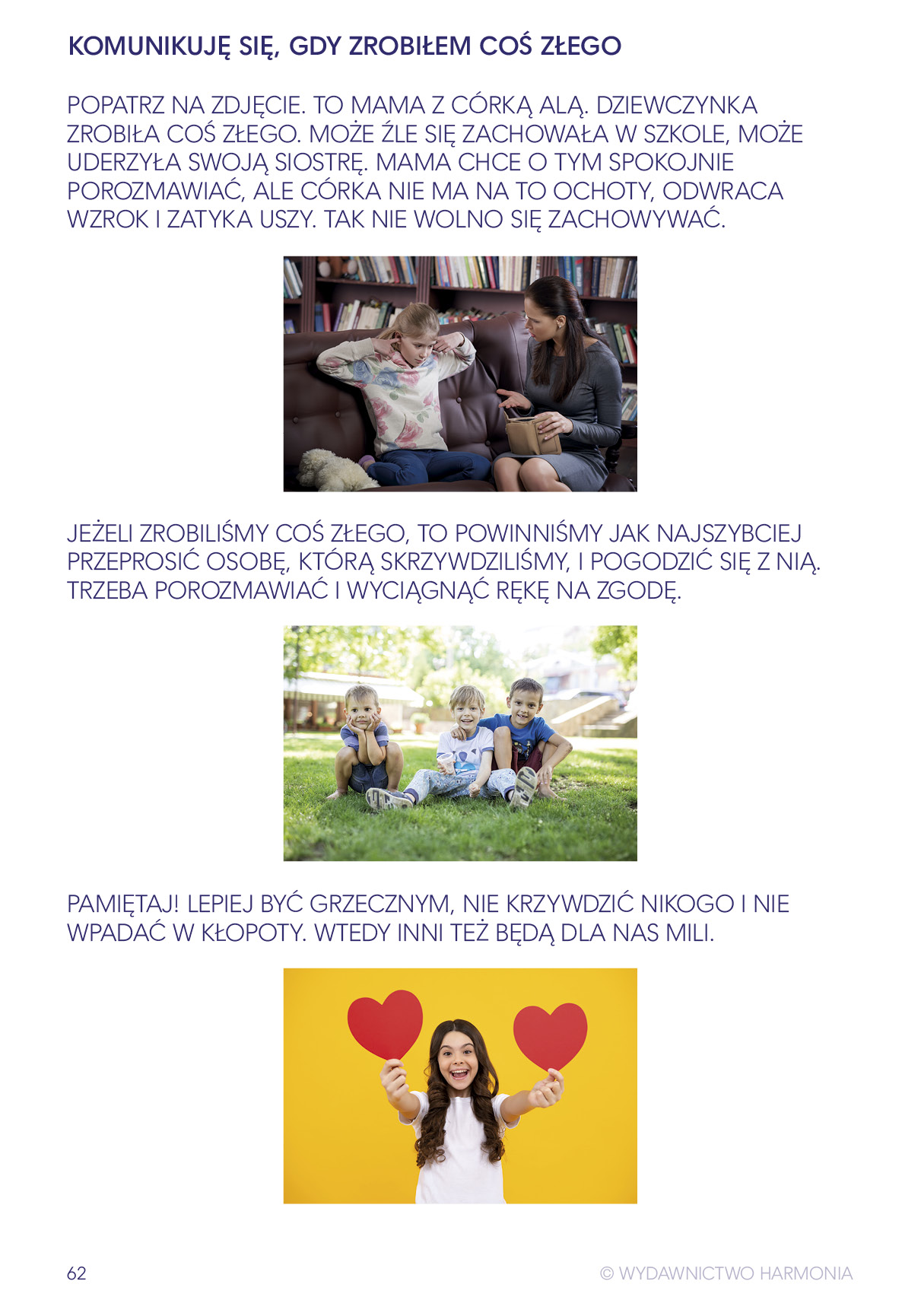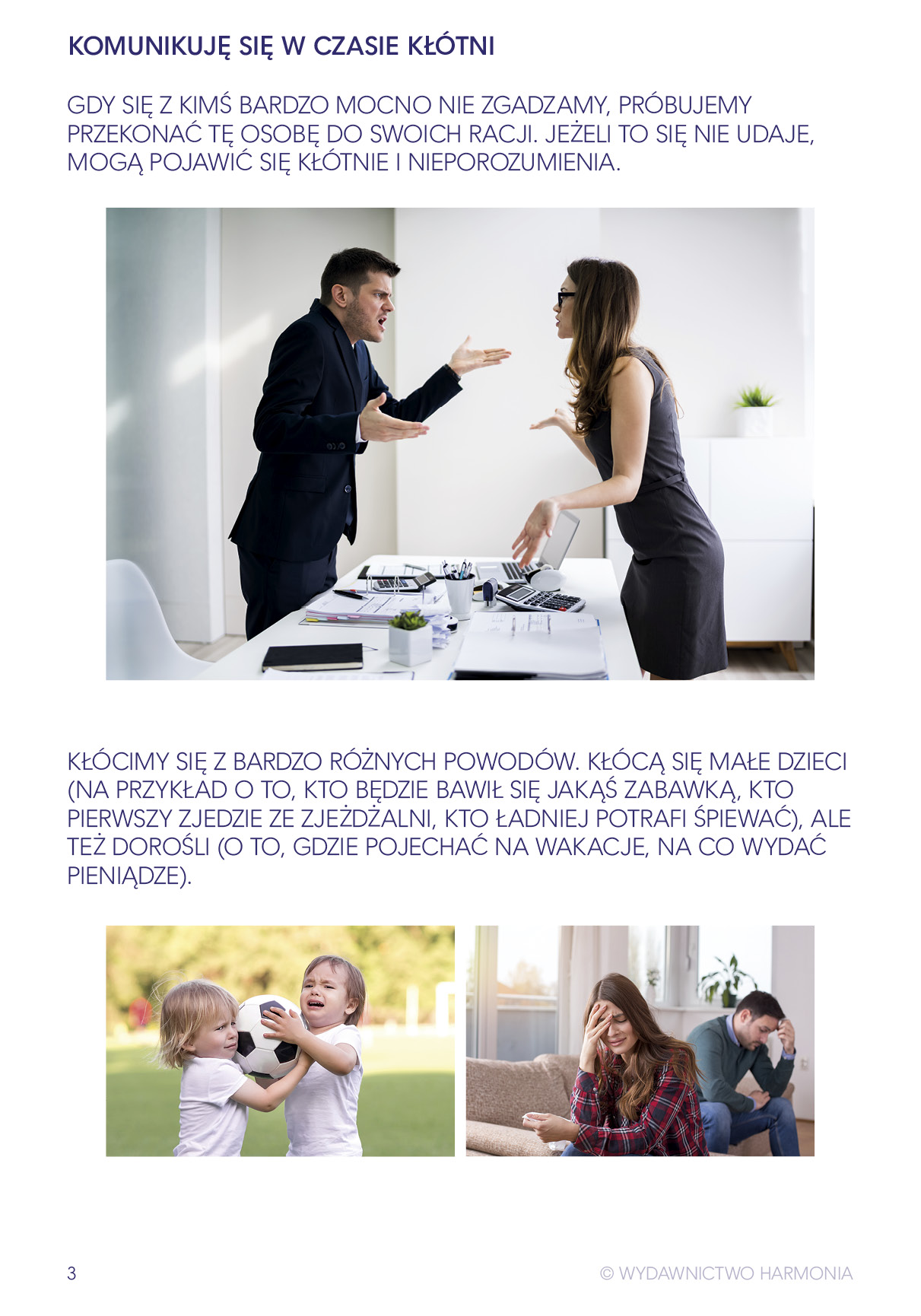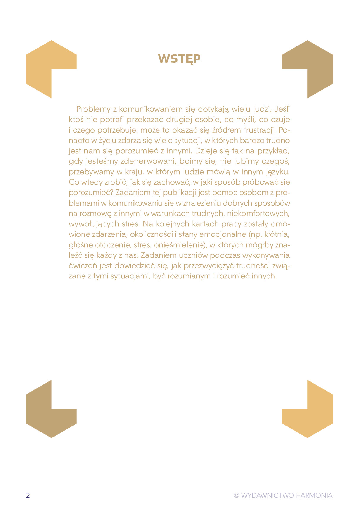 Na kolejnych kartach pracy zostały omówione zdarzenia, okoliczności oraz stany emocjonalne (np. kłótnia, głośne otoczenie, stres, onieśmielenie), w których mógłby znaleźć się każdy z nas. Zadaniem uczniów podczas wykonywania ćwiczeń jest dowiedzieć się, jak przezwyciężyć trudności związane z tymi sytuacjami, być rozumianym i rozumieć innych.