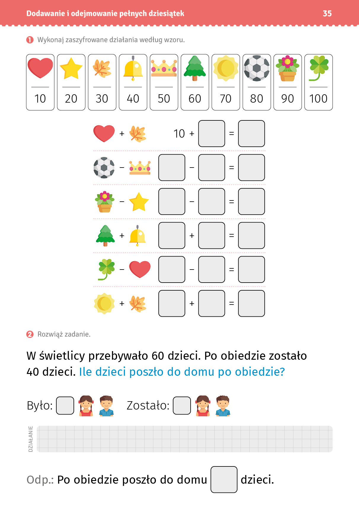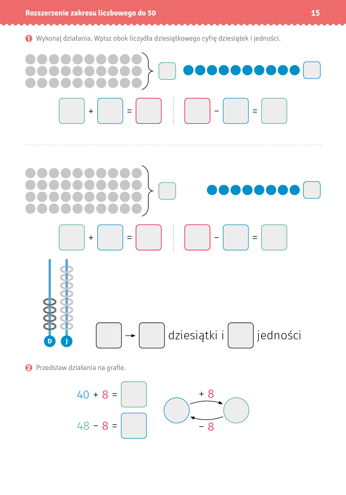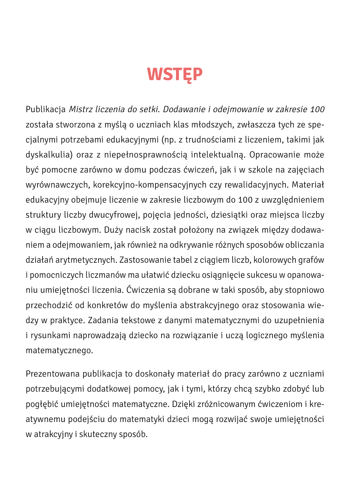 Publikacja została stworzona z myślą o uczniach klas młodszych, zwłaszcza tych ze specjalnymi potrzebami edukacyjnymi (np. z trud¬nościami z liczeniem, takimi jak dyskalkulia) oraz z niepełnospraw¬nością intelektualną. Opracowanie może być pomocne zarówno w domu podczas ćwiczeń, jak i w szkole na zajęciach wyrównaw¬czych, korekcyjno-kompensacyjnych czy rewalidacyjnych.