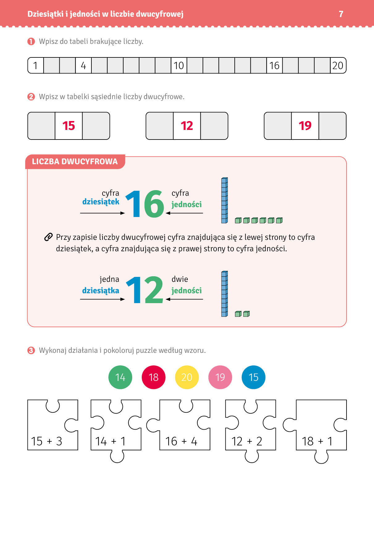 Materiał edukacyjny obejmuje liczenie w zakresie liczbowym do 100 z uwzględnieniem struktury liczby dwucyfrowej, pojęcia jedno¬ści, dziesiątki oraz miejsca liczby w ciągu liczbowym. Ćwiczenia są dobrane w taki sposób, aby stopniowo przechodzić od konkretów do myślenia abstrakcyjnego oraz stosowania wiedzy w praktyce.