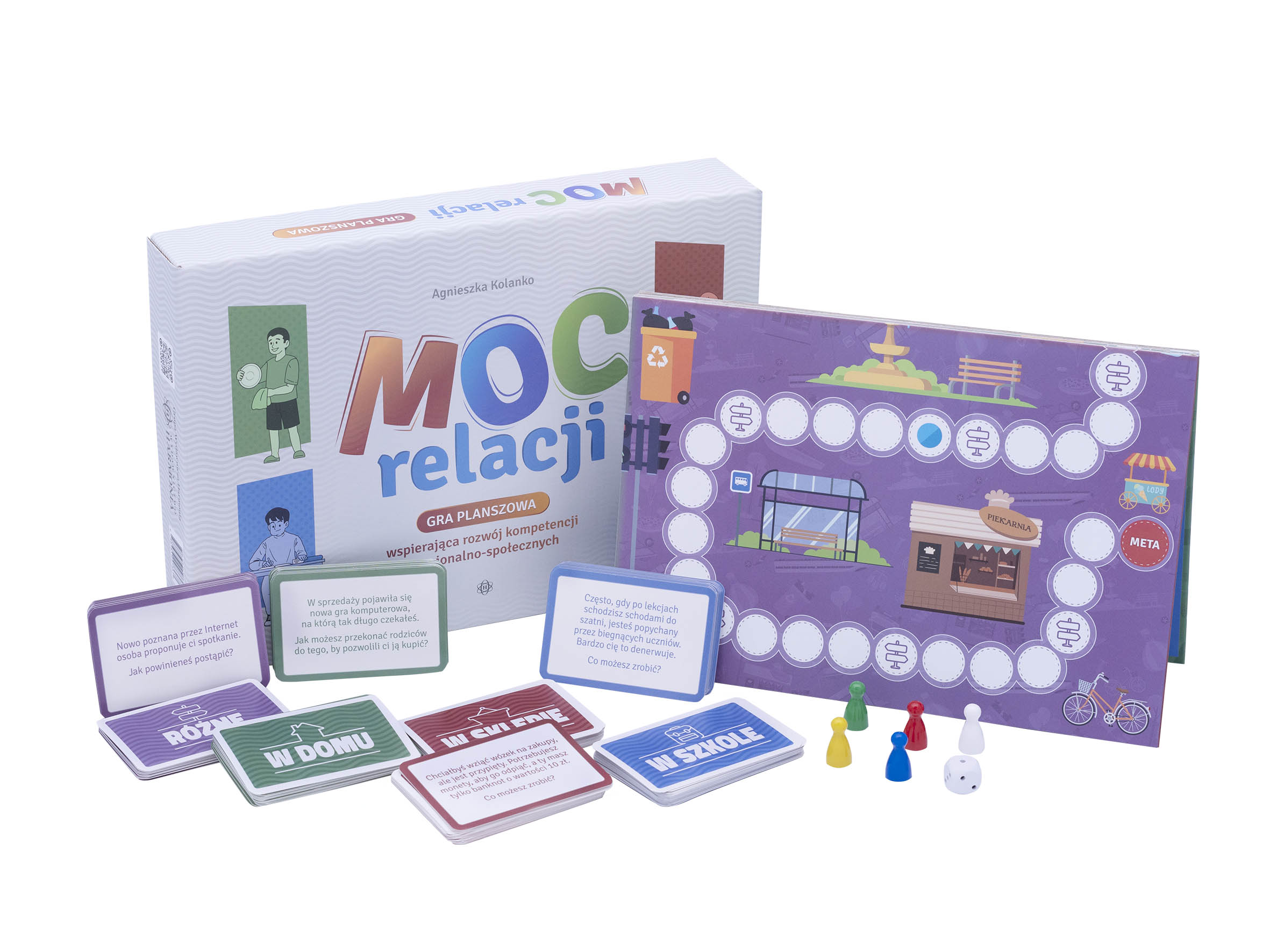 „Moc relacji” to gra planszowa opracowana przede wszystkim dla uczniów z trudnościami w nabywaniu kompetencji społeczno-emocjonalnych. Doskonale sprawdzi się w pracy specjalistów prowadzących zajęcia z dziećmi w wieku szkolnym: trenerów TUS, wychowawców, pedagogów i psychologów szkolnych. Może być także świetną pomocą dla rodziców szukających wartościowych sposobów spędzania wolnego czasu z dziećmi.