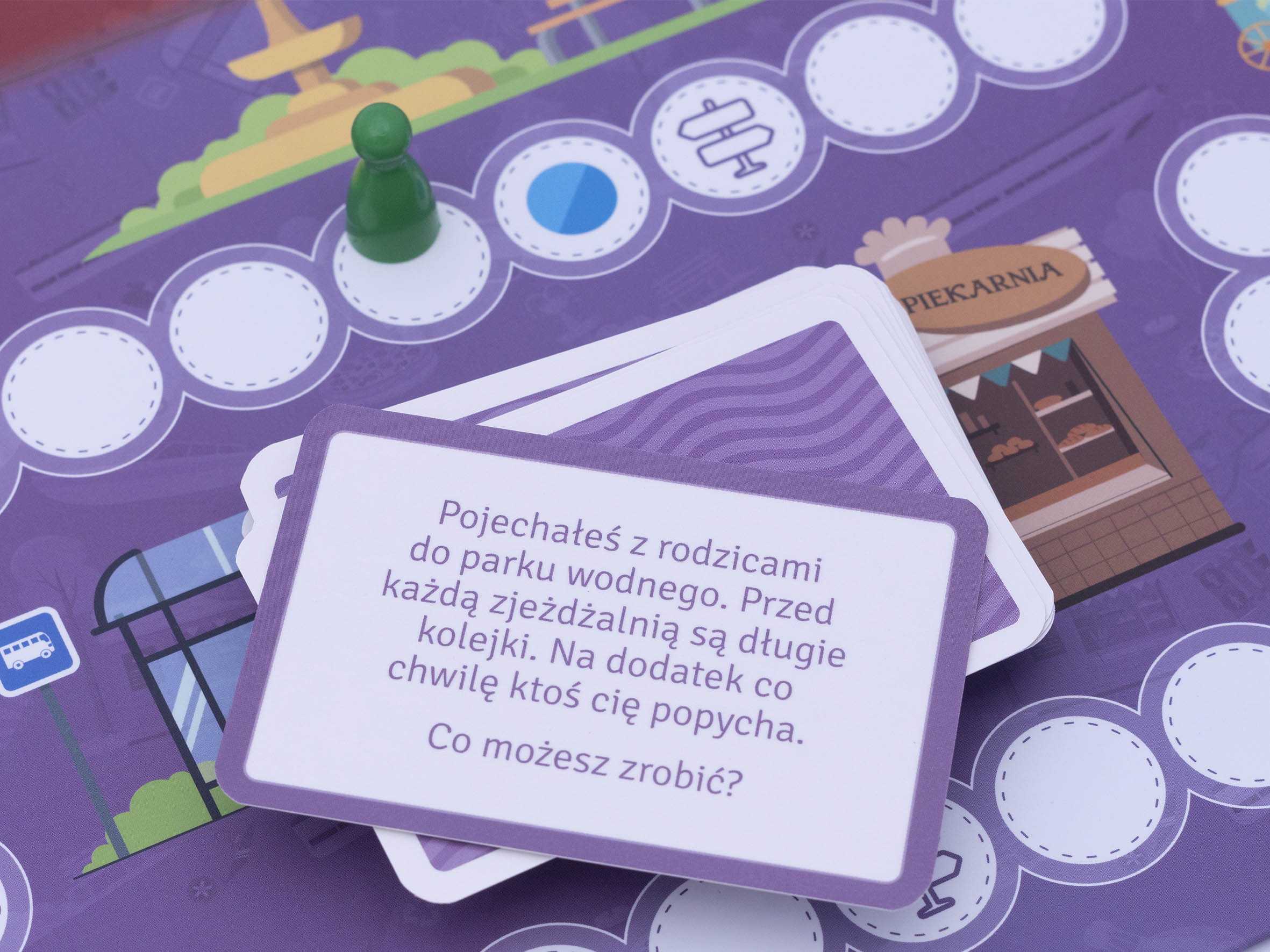 Gracze kolejno rzucają kostką i poruszają się pionkami po planszy podzielonej na 4 obszary symbolizujące różne przestrzenie społeczne: dom, szkołę, sklep i inne miejsca publiczne. Po drodze trafiają na określone pola specjalne i wykonują różne akcje, np. losują karty z określonej kategorii, a następnie odpowiadają na pytania o odczuwane emocje czy sposoby zachowania w różnych sytuacjach. W ten sposób przy okazji dobrej zabawy gracze trenują różne kompetencje społeczne. Uczą się między innymi: