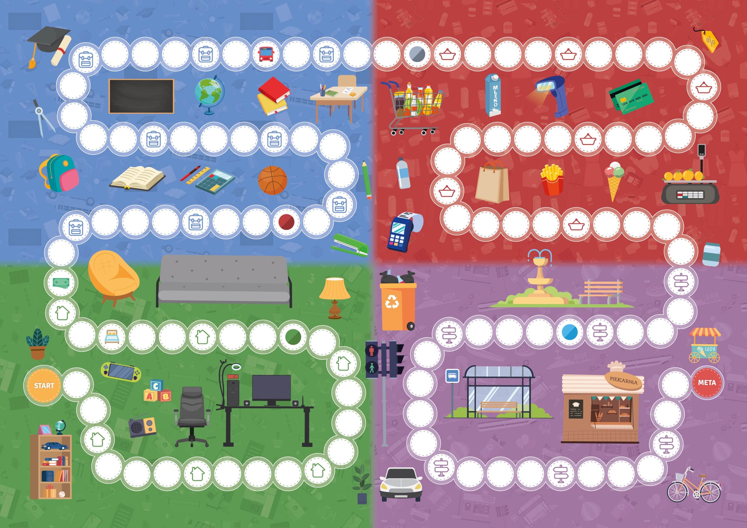 - duża plansza do gry podzielona na 4 obszary: W DOMU, W SZKOLE, W SKLEPIE, RÓŻNE