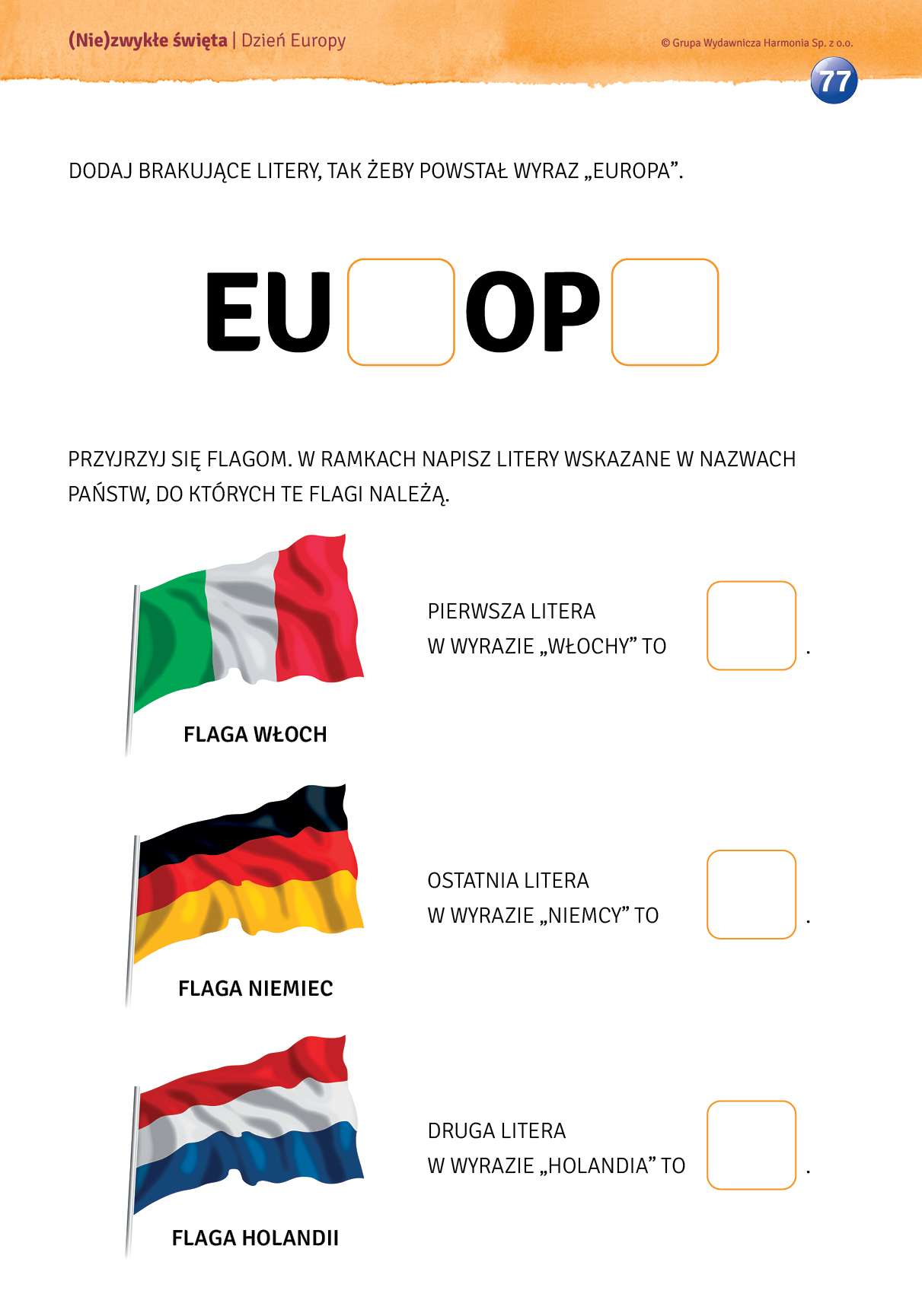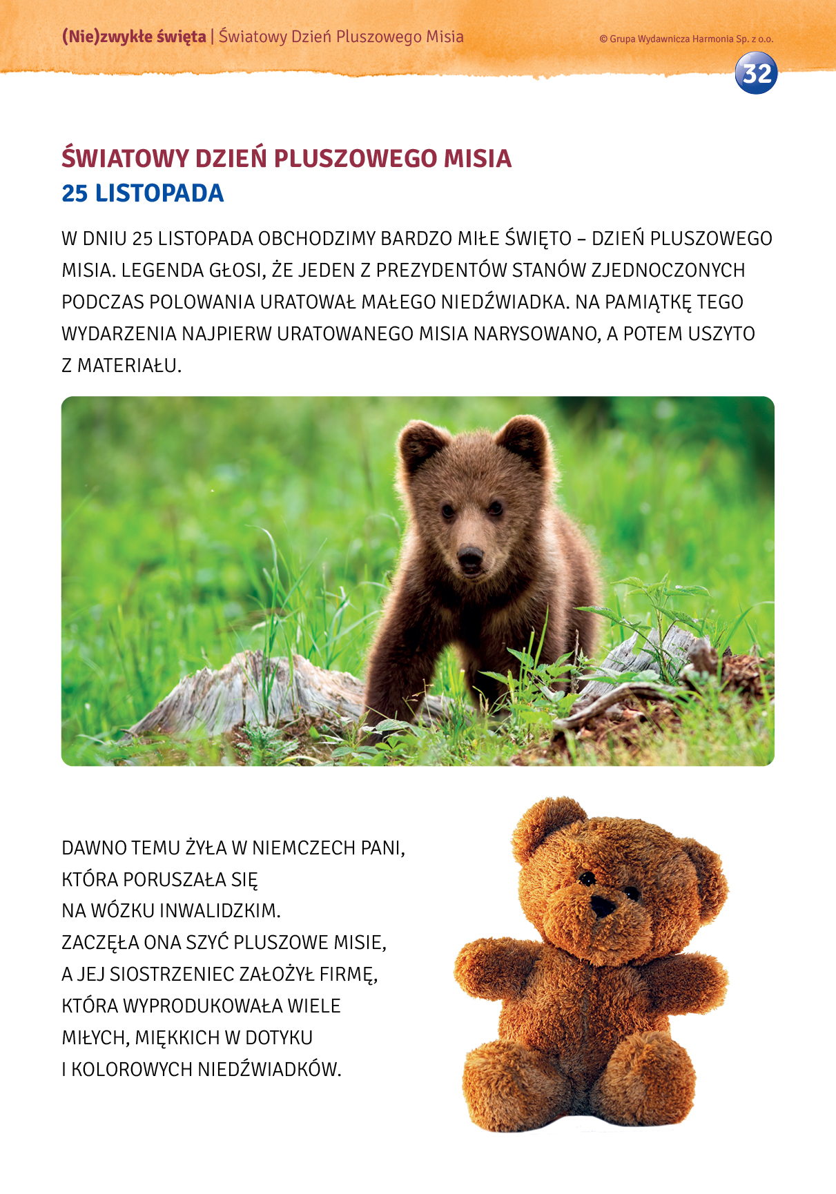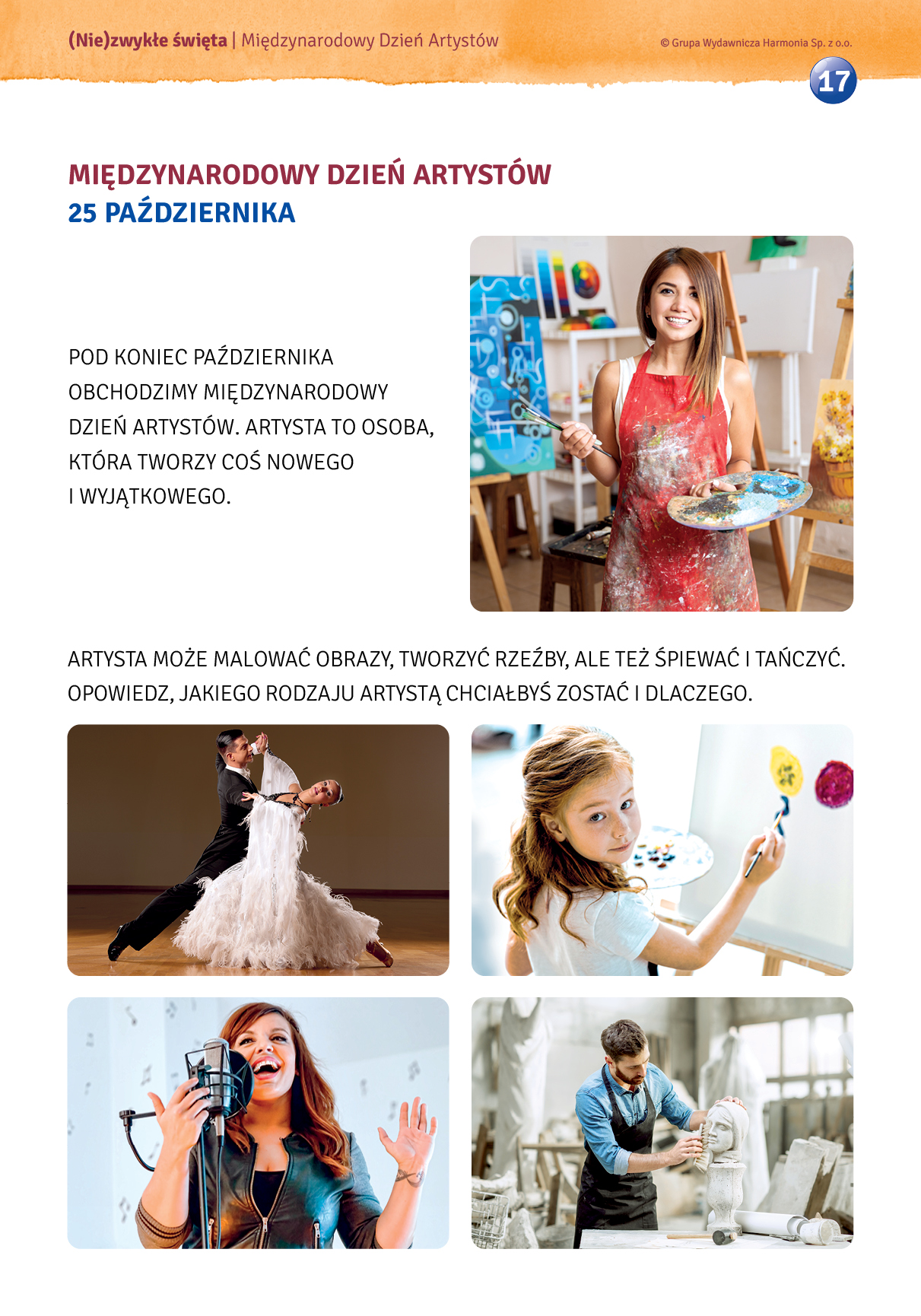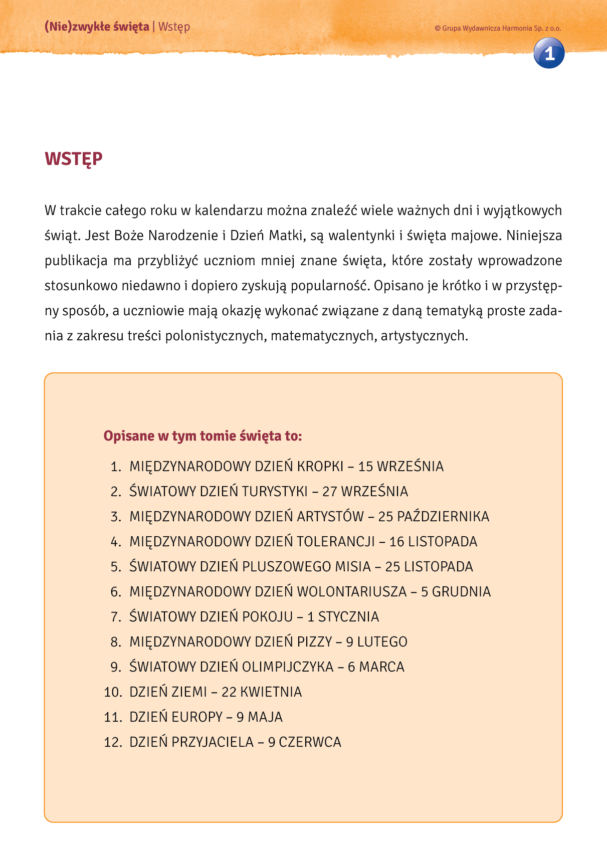 W trakcie całego roku w kalendarzu można znaleźć wiele ważnych dni i wyjątkowych świąt, takich jak Boże Narodzenie, Dzień Matki czy walentynki. Ta publikacja ma przybliżyć czytelnikom mniej znane święta, które zostały wprowadzone stosunkowo niedawno i dopiero zyskują popularność. Opisano je krótko i w przystępny sposób, a także uatrakcyjniono prostymi zadaniami z zakresu treści polonistycznych, matematycznych oraz artystycznych.