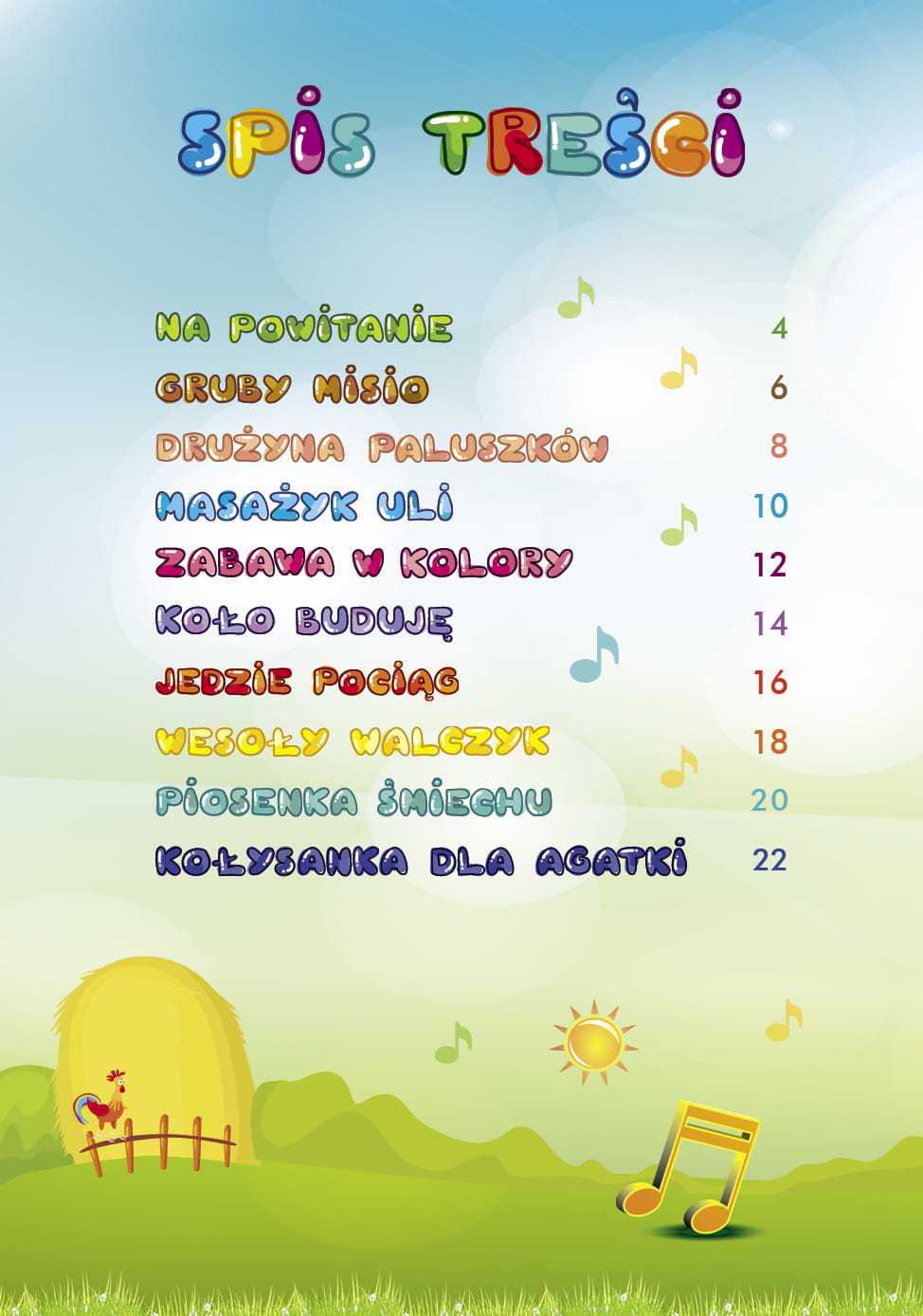 Jest to zbiór dziesięciu piosenek i zabaw przeznaczonych zarówno dla przedszkolaków, jak i dzieci w młodszym wieku szkolnym. Utwory mają prostą melodię i łatwe do zapamiętania słowa, a zabawy są krótkie i lubiane przez dzieci. Wśród przedstawionych propozycji jest m.in. zabawa na powitanie, zabawa paluszkowa, masażyk, zabawa w kole czy w pociąg. Dzieci bawiąc się, doskonalą koordynację ruchową i orientację przestrzenną, kształcą uwagę i pamięć, uczą się wyrażać emocje, a przede wszystkim przyjemnie spędzają czas.