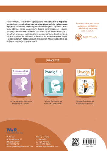 Publikacja stanowi cenne uzupełnienie terapii psychologicznej i logopedycznej oraz doskonały materiał do samodzielnych ćwiczeń w domu. Umożliwia skuteczny trening grafomotoryczny zarówno dzieci, jak i dorosłych oraz seniorów.