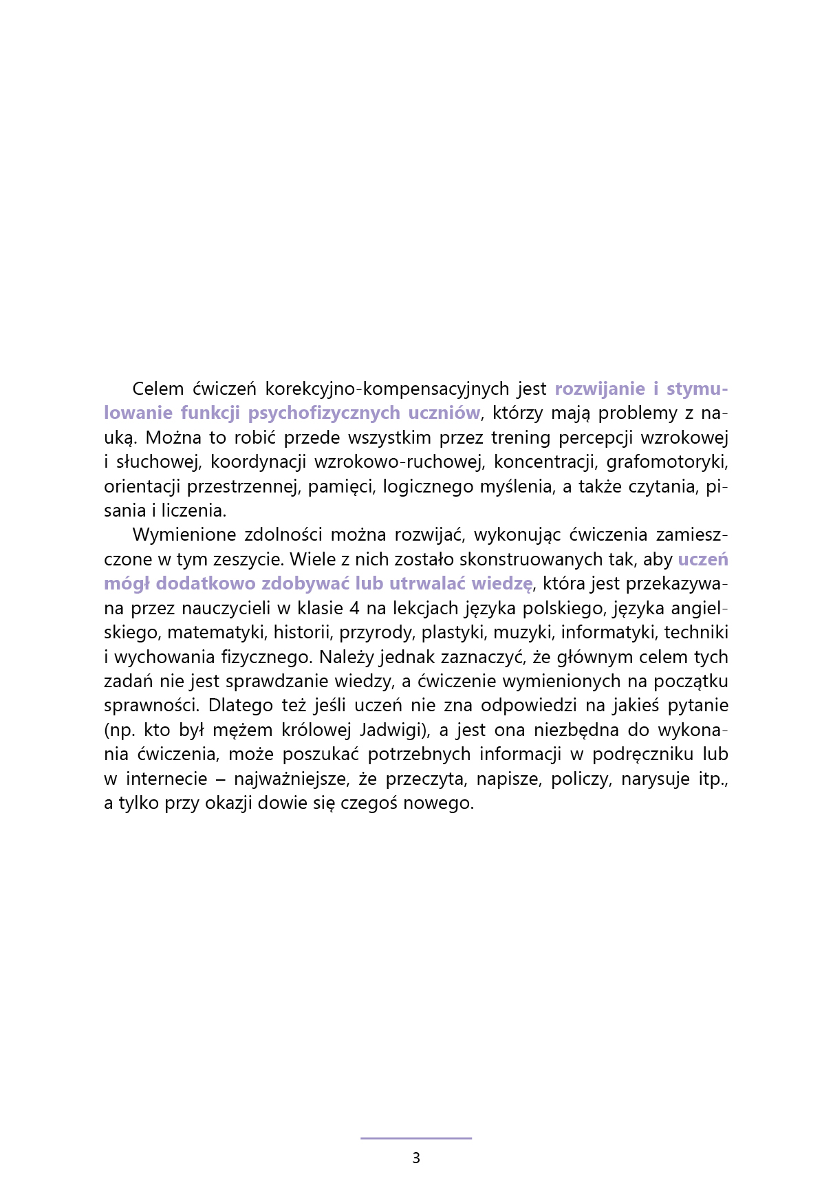 Wymienione zdolności można rozwijać, wykonując ćwiczenia zamieszczone w tym zeszycie. Wiele z nich zostało skonstruowanych tak, aby uczeń mógł dodatkowo zdobywać lub utrwalać wiedzę z zakresu języka polskiego, języka angielskiego, matematyki, historii, przyrody, plastyki, muzyki, informatyki, techniki i wychowania fizycznego.