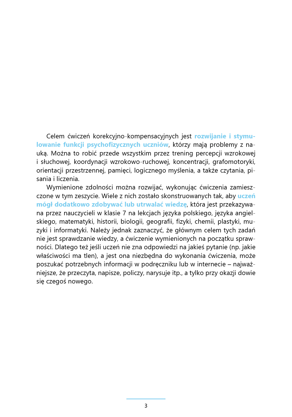 Przyjmuję wyzwanie! Ćwiczenia korekcyjno-kompensacyjne. Klasa 7 to zbiór zadań mających na celu rozwijanie i stymulowanie funkcji psychofizycznych uczniów, którzy mają problemy z nauką. Można to robić przez trening percepcji wzrokowej i słuchowej, koordynacji wzrokowo-ruchowej, koncentracji, grafomotoryki, orientacji przestrzennej, pamięci, logicznego myślenia, a także czytania, pisania i liczenia.