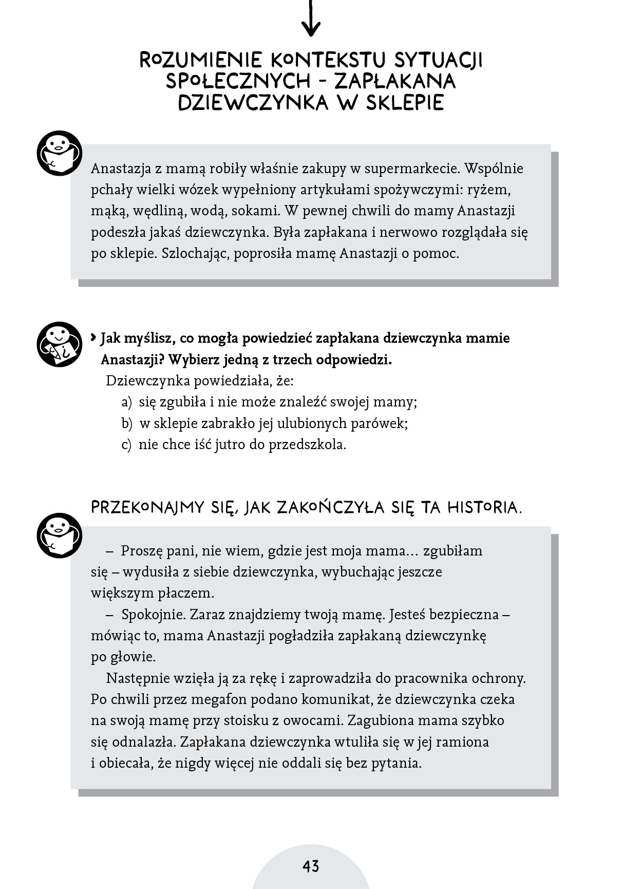 Książka zawiera zestaw ćwiczeń wspomagających uczniów klas I–III z zaburzeniami ze spektrum autyzmu w doskonaleniu kompetencji społeczno-emocjonalnych i poznawczych ze szczególnym uwzględnieniem następujących obszarów: trening umiejętności społecznych, teoria umysłu, centralna koherencja oraz emocje. Może zostać wykorzystana również w przypadku pracy z dziećmi z niepełnosprawnością intelektualną w stopniu lekkim, afazją, zespołem nadpobudliwości psychoruchowej (ADHD) czy niedostosowanych społecznie.