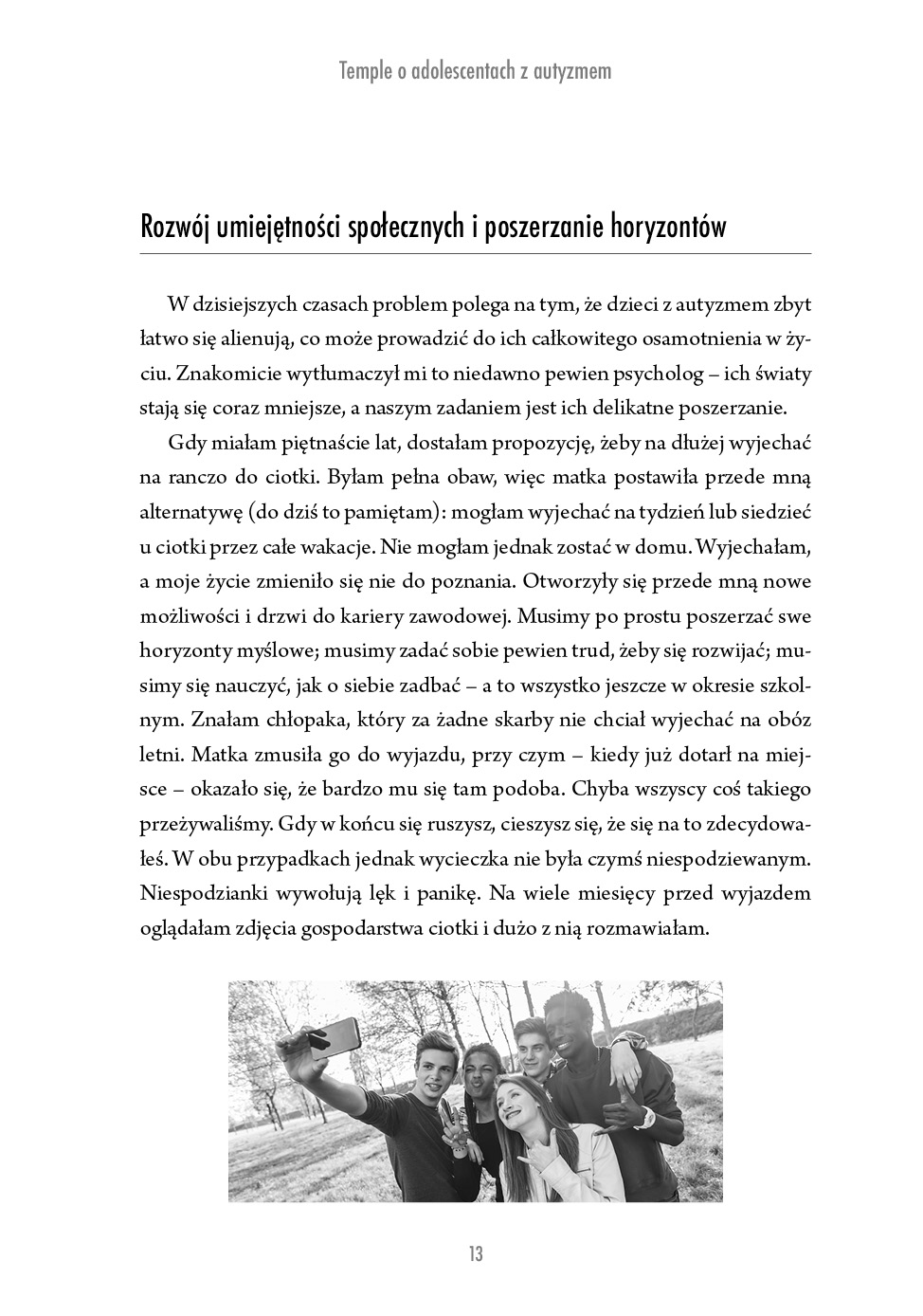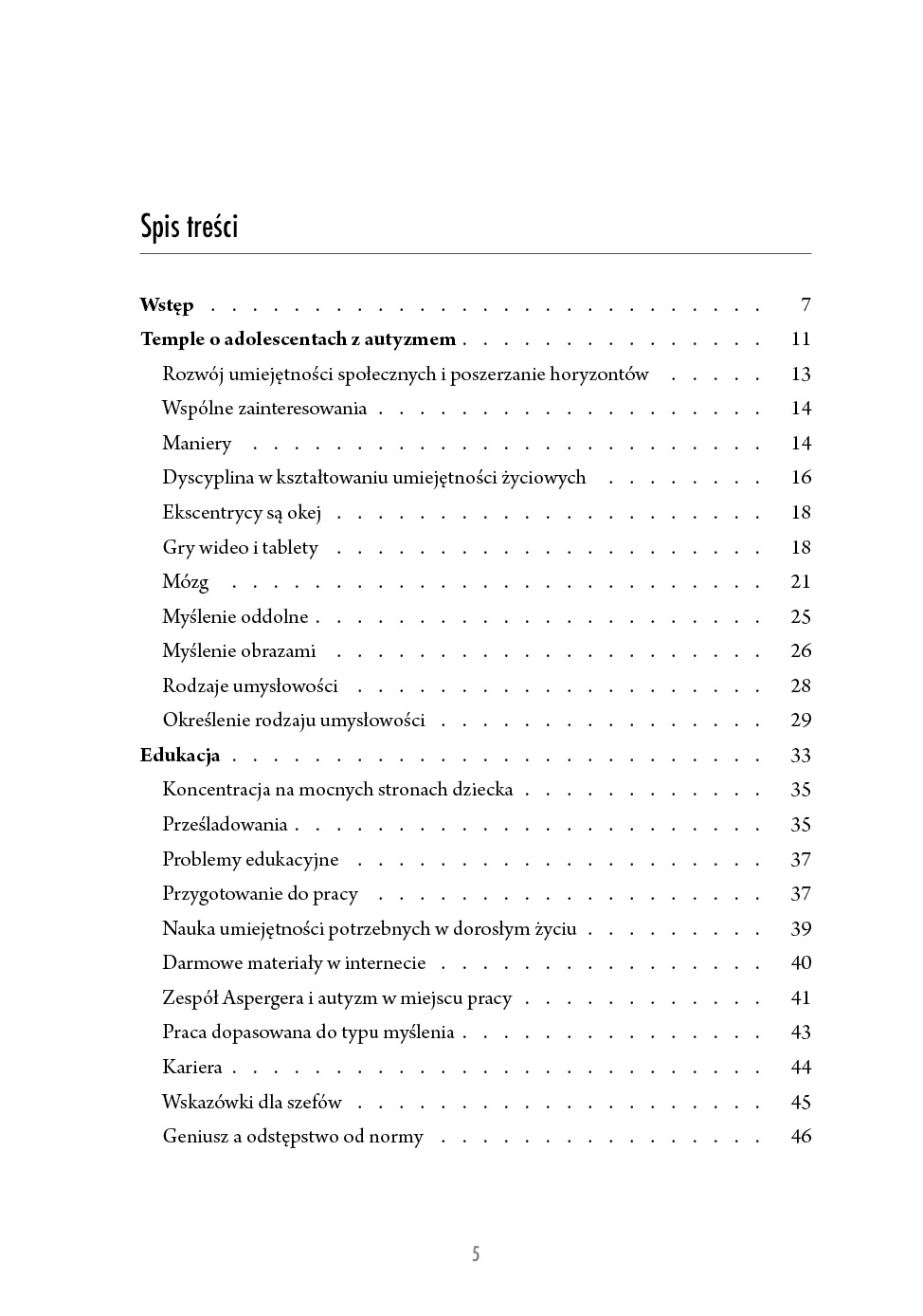 Autorka opowiada o swoich doświadczeniach szkolnych, okresie dojrzewania i pierwszych krokach na rynku pracy z perspektywy osoby z zaburzeniami z ASD. Doświadczenia własne autorki stanowią pretekst do przekazania Czytelnikowi rad dotyczących kierowania karierą adolescenta z autyzmem. W książce skupiono się na sposobie funkcjonowania poznawczo-społecznego osób ze spektrum. Grandin używa prostego języka, a jej narracja nie przytłacza nadmiarem faktów naukowych.