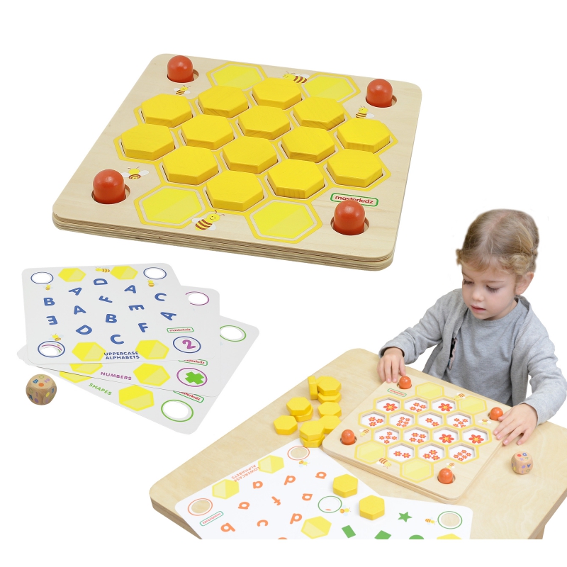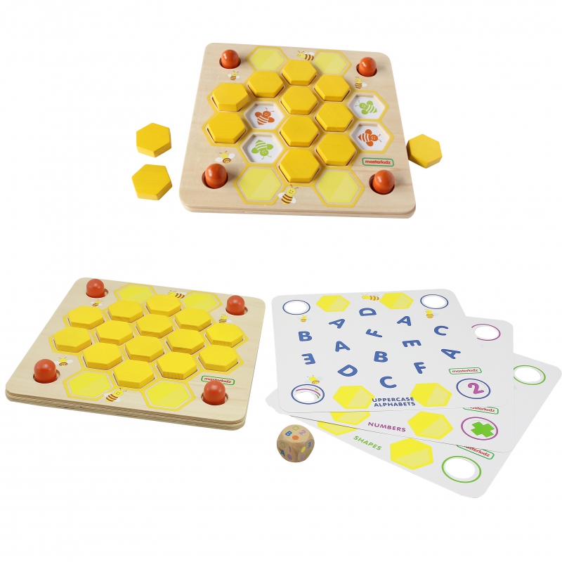 - – w zestawie znajduje się plansza z klockami oraz 3 karty (z rysunkami z obydwu stron)