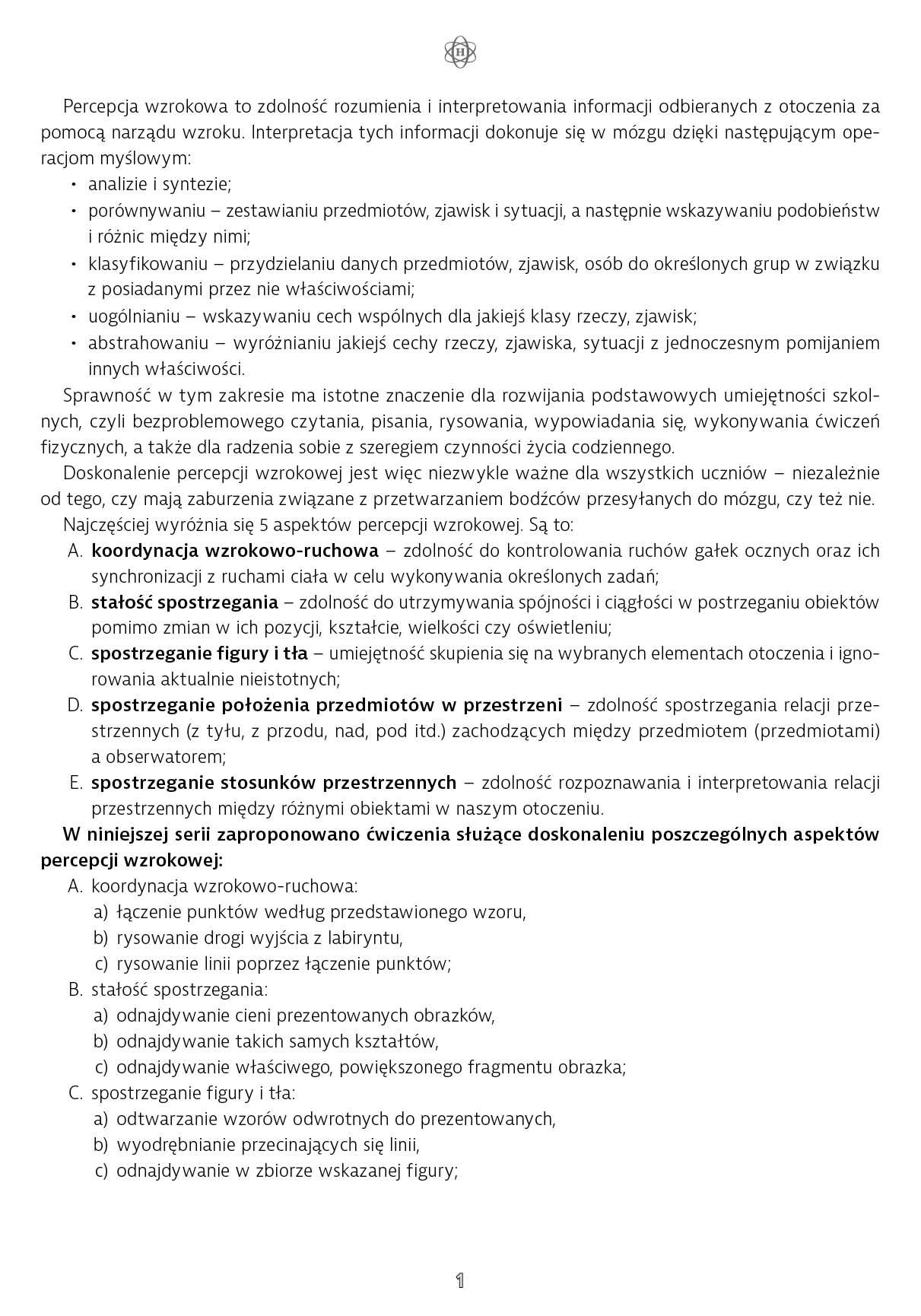 Prezentowane karty pracy mają służyć doskonaleniu percepcji wzrokowej, czyli umiejętności rozumienia i interpretowania informacji odbieranych z otoczenia za pomocą wzroku. Większość ćwiczeń przeznaczona jest dla starszych uczniów (klasy IV–VIII szkoły podstawowej i szkoła ponadpodstawowa), jednak możliwość wykonywania tylko wybranych poziomów zadań pozwala wykorzystać je również w pracy z uczniami młodszymi.