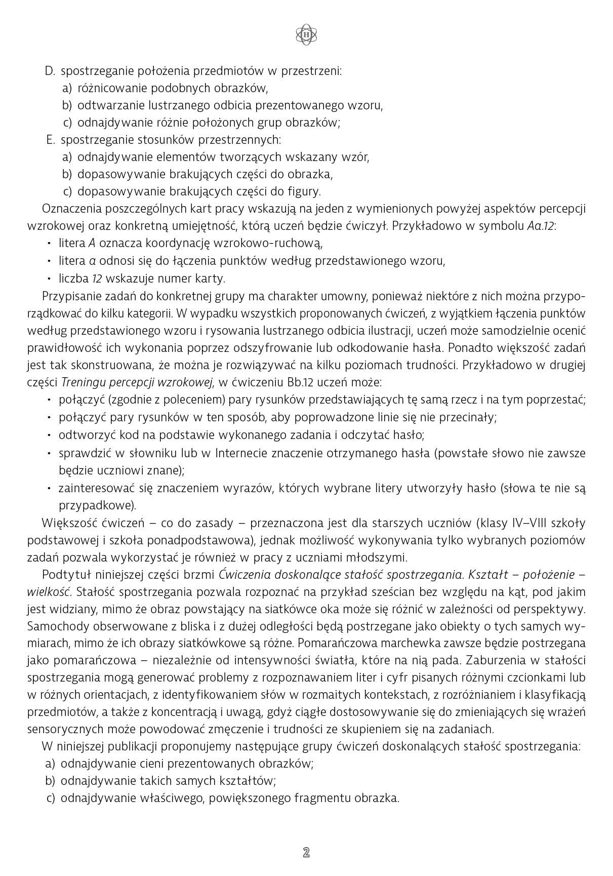 Podtytuł niniejszej części brzmi Ćwiczenia doskonalące stałość spostrzegania. Kształt – położenie – wielkość. Zaburzenia w stałości spostrzegania mogą generować problemy z rozpoznawaniem liter i cyfr pisanych różnymi czcionkami lub w różnych orientacjach, z identyfikowaniem słów w rozmaitych kontekstach, z rozróżnianiem i klasyfikacją przedmiotów, a także z koncentracją i uwagą, gdyż ciągłe dostosowywanie się do zmieniających się wrażeń sensorycznych może powodować zmęczenie i trudności ze skupieniem się na zadaniach.