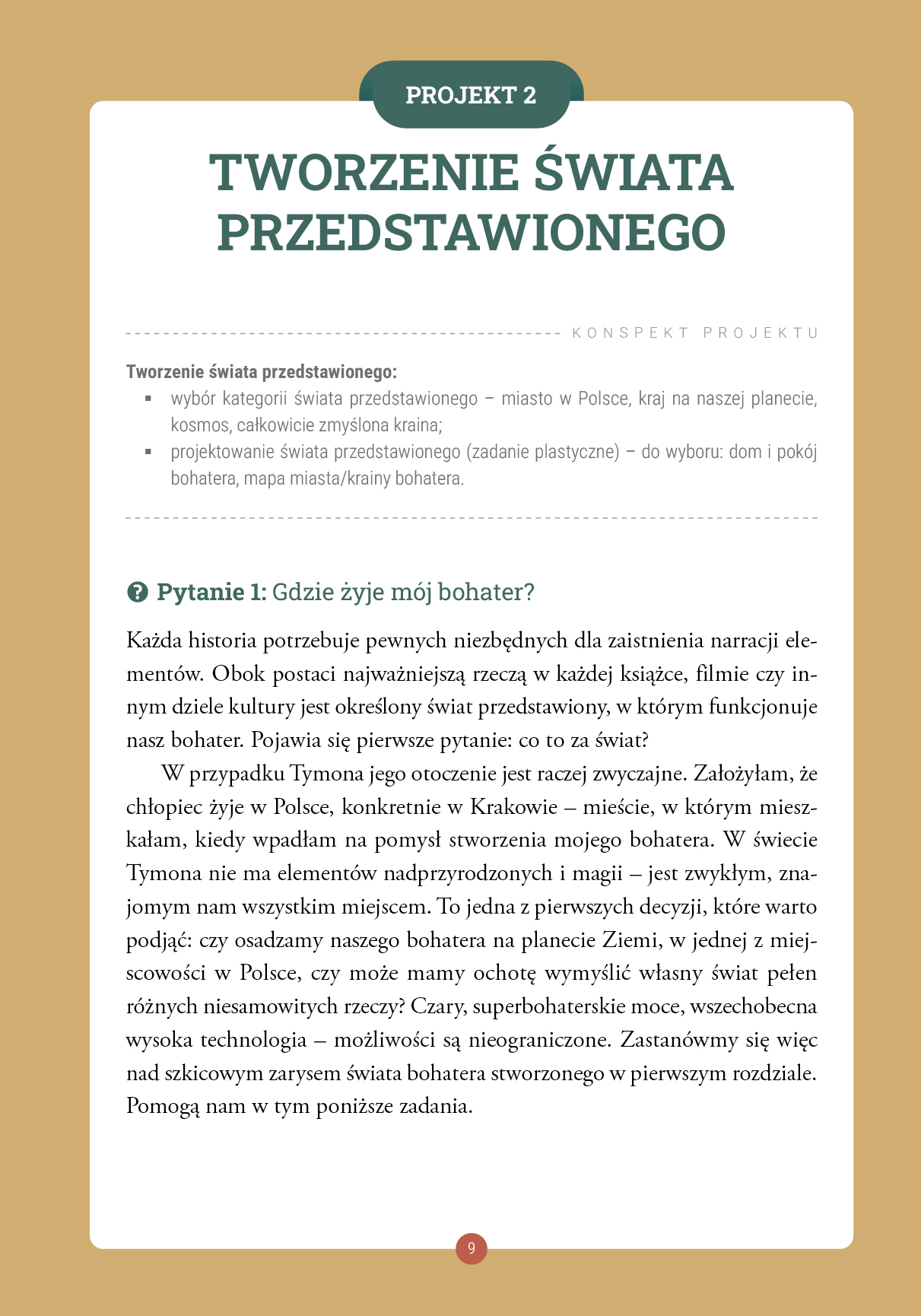 Książka składa się z dziesięciu rozdziałów – projektów, które przeprowadzą czytelnika przez proces tworzenia postaci i opowieści. Omówiono w nich jego najważniejsze elementy, takie jak wygląd i tożsamość bohatera, jego mocne i słabe strony czy struktura historii. Zaproponowano również stworzenie krótkich dzieł kultury – gry planszowej i komiksu, a także wskazano popularne i wykorzystywane przez innych twórców elementy, które można zawrzeć w stworzonej przez siebie charakterystyce postaci.