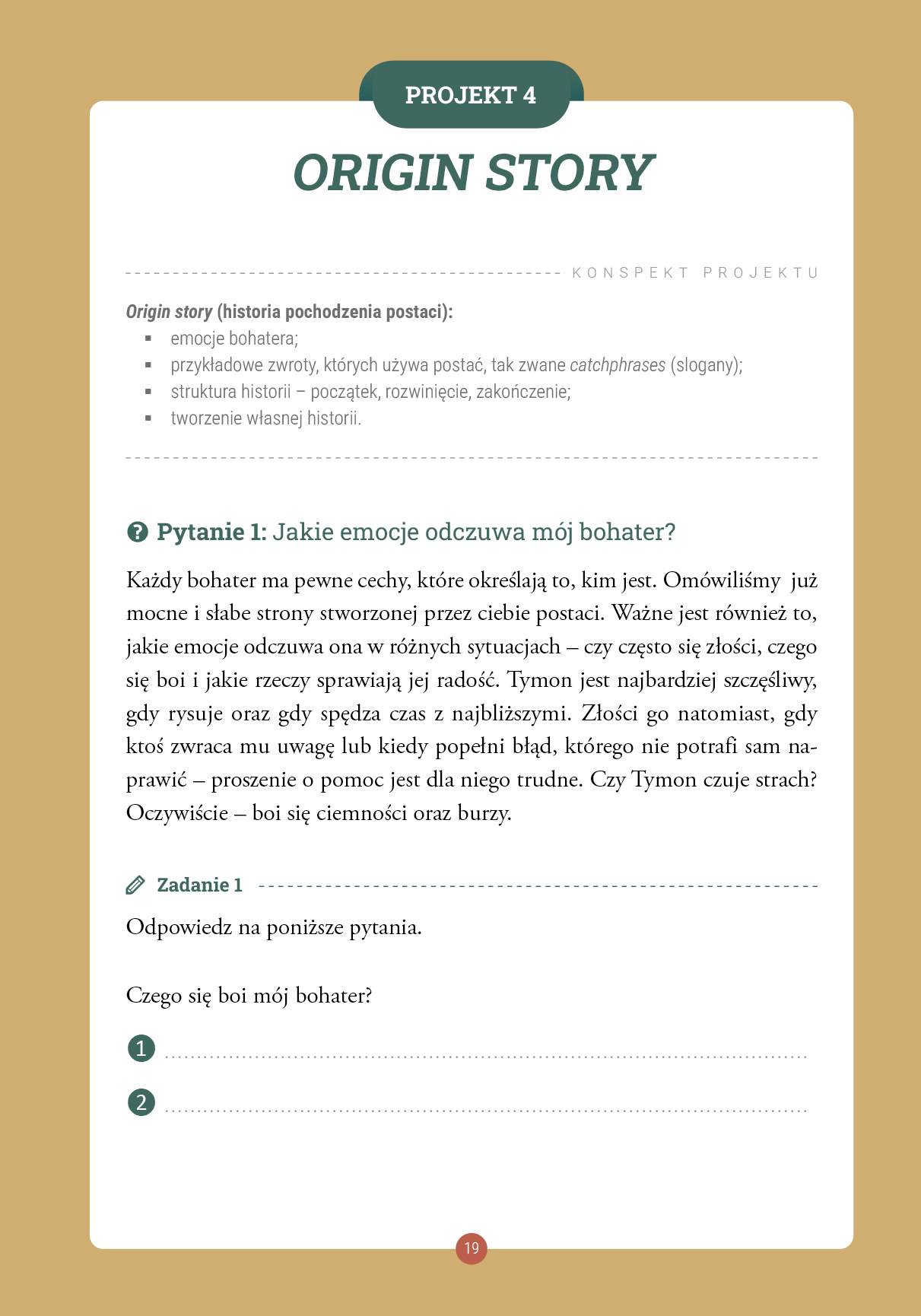 Tymon i ja to publikacja, której celem jest stworzenie własnego bohatera i wymyślenie historii z jego udziałem. Tworzenie swojej postaci ma na celu możliwość znalezienia punktu odniesienia do własnych przeżyć, porównanie siebie i kogoś innego. Może to ułatwić rozmowę na temat swoich emocji i sposobów radzenia sobie z nimi.