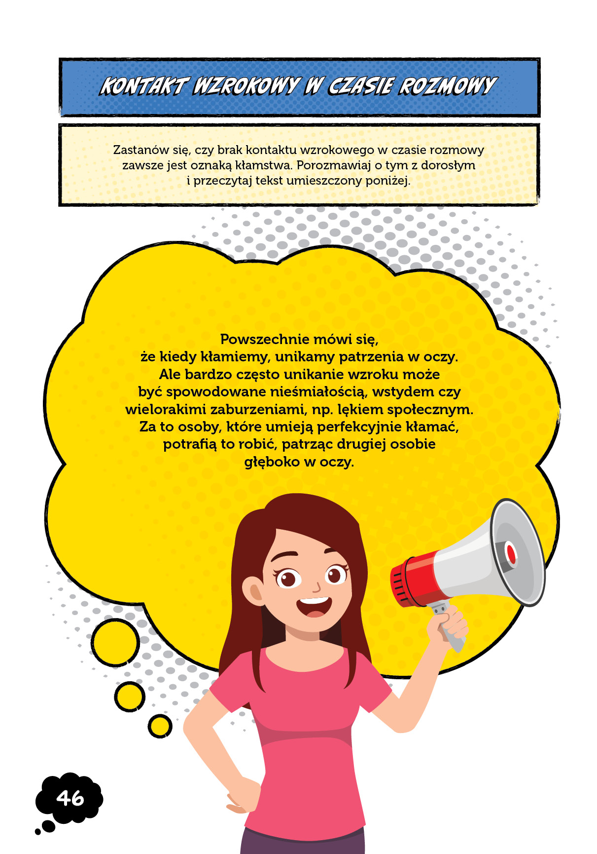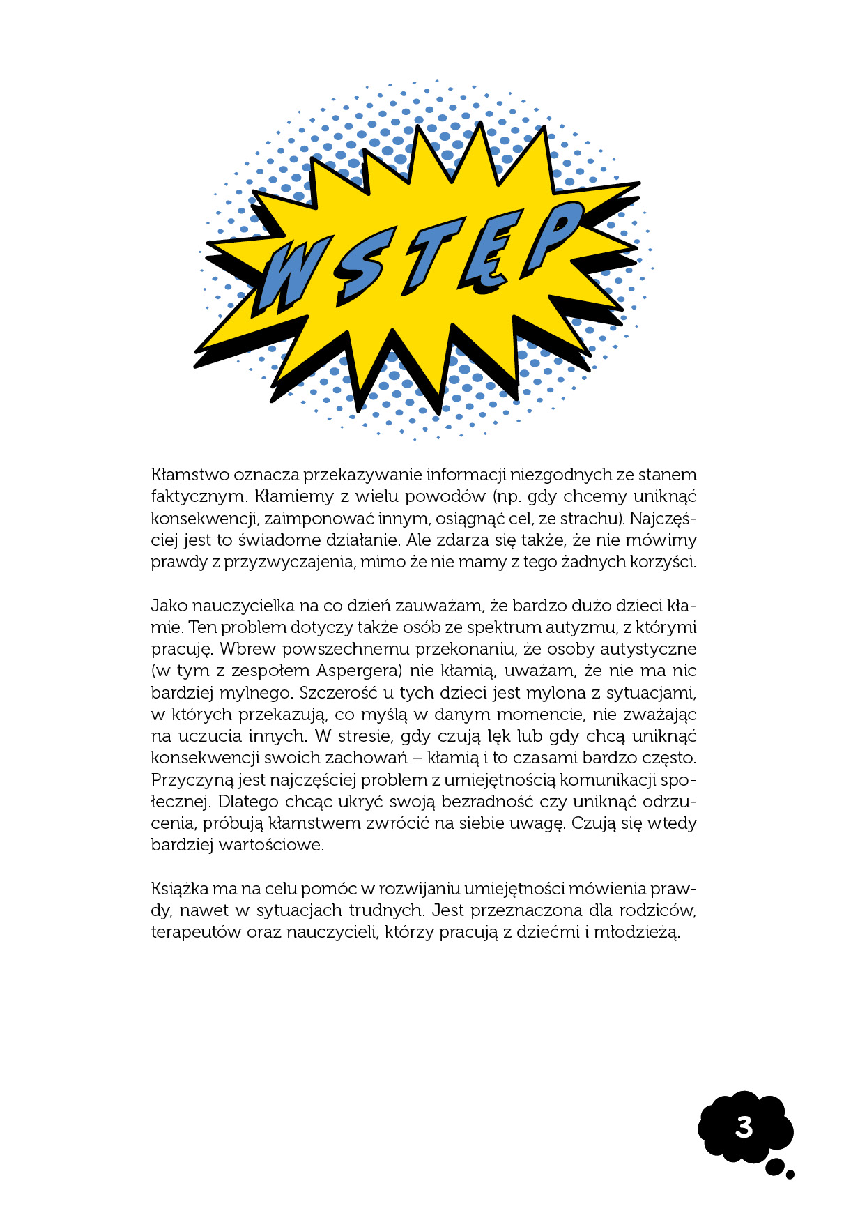 Karty pracy, przeznaczone dla uczniów w wieku 8–15 lat, zawierają ćwiczenia przydatne przy rozwijaniu umiejętności mówienia prawdy, nawet w trudnych sytuacjach. Książka została opracowana z myślą o terapii dzieci i młodzieży ze spektrum autyzmu oraz wszystkich tych, którzy mają problemy z prawdomównością. Najczęściej kłopoty te są tylko skutkiem innych trudności – braku wystarczających kompetencji społecznych, komunikacyjnych i związanych z zarządzaniem własnymi emocjami.