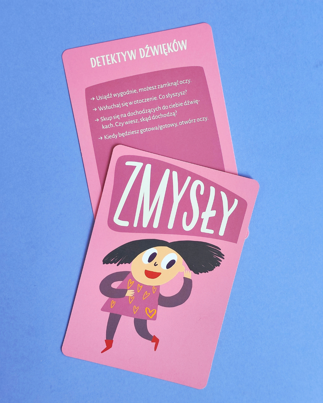 - 50 kart podzielonych na 7 kategorii: oddech, relaksacja, wizualizacja, ciało, otoczenie, zmysły, wyciszanie