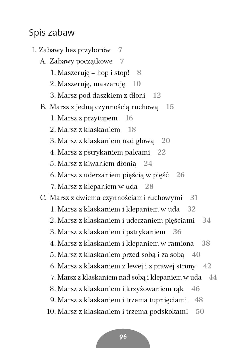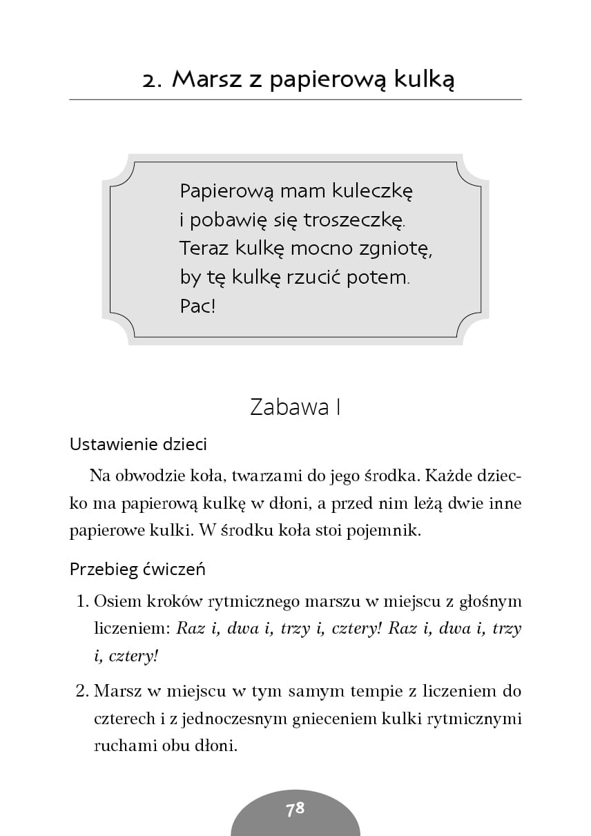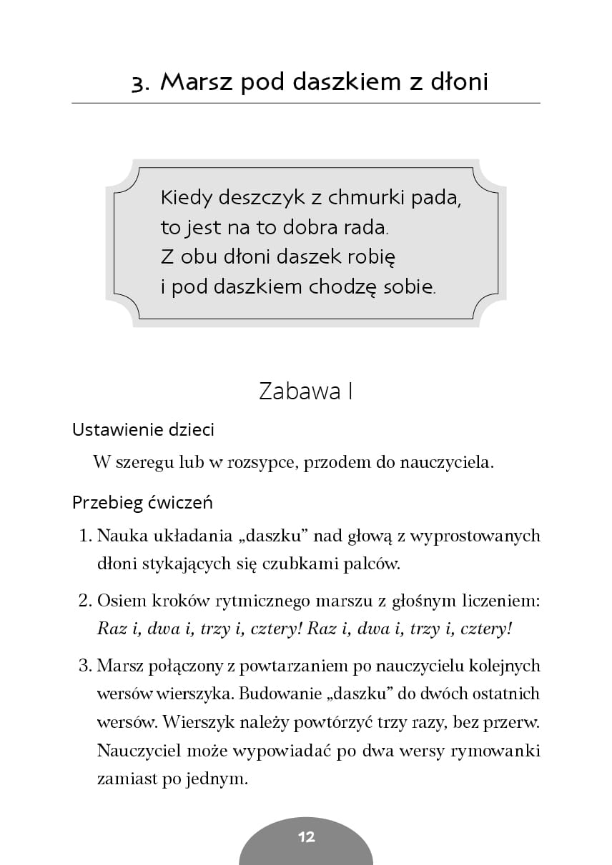 W marszu mówię, klaszczę, gram… to publikacja skierowana do nauczycieli przedszkolaków, dzieci ze specjalnymi potrzebami edukacyjnymi oraz uczniów młodszych klas, którzy szukają sposobów, dzięki którym będą mogli kształtować funkcje percepcyjno-motoryczne swoich podopiecznych. W książeczce zamieszczono 40 wierszyków oraz 79 opisów zabaw, których podstawą jest marsz. Dzieci oraz nauczyciel maszerują w każdej kolejnej zabawie, a oprócz tego jednocześnie wykonują określony ruch rękami lub sekwencję takich ruchów. Słuchanie, a następnie powtarzanie fragmentów wierszyków rozwija uwagę i pamięć słuchową, jednoczesne wykonywanie więcej niż jednej czynności zaś – koordynację ruchową oraz ruchowo-słuchową.